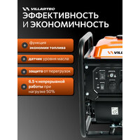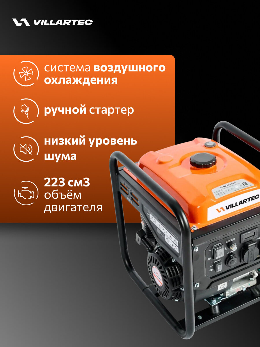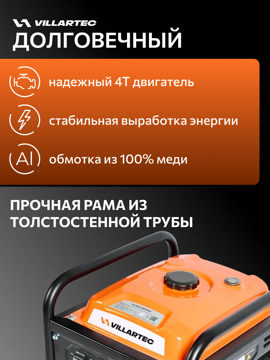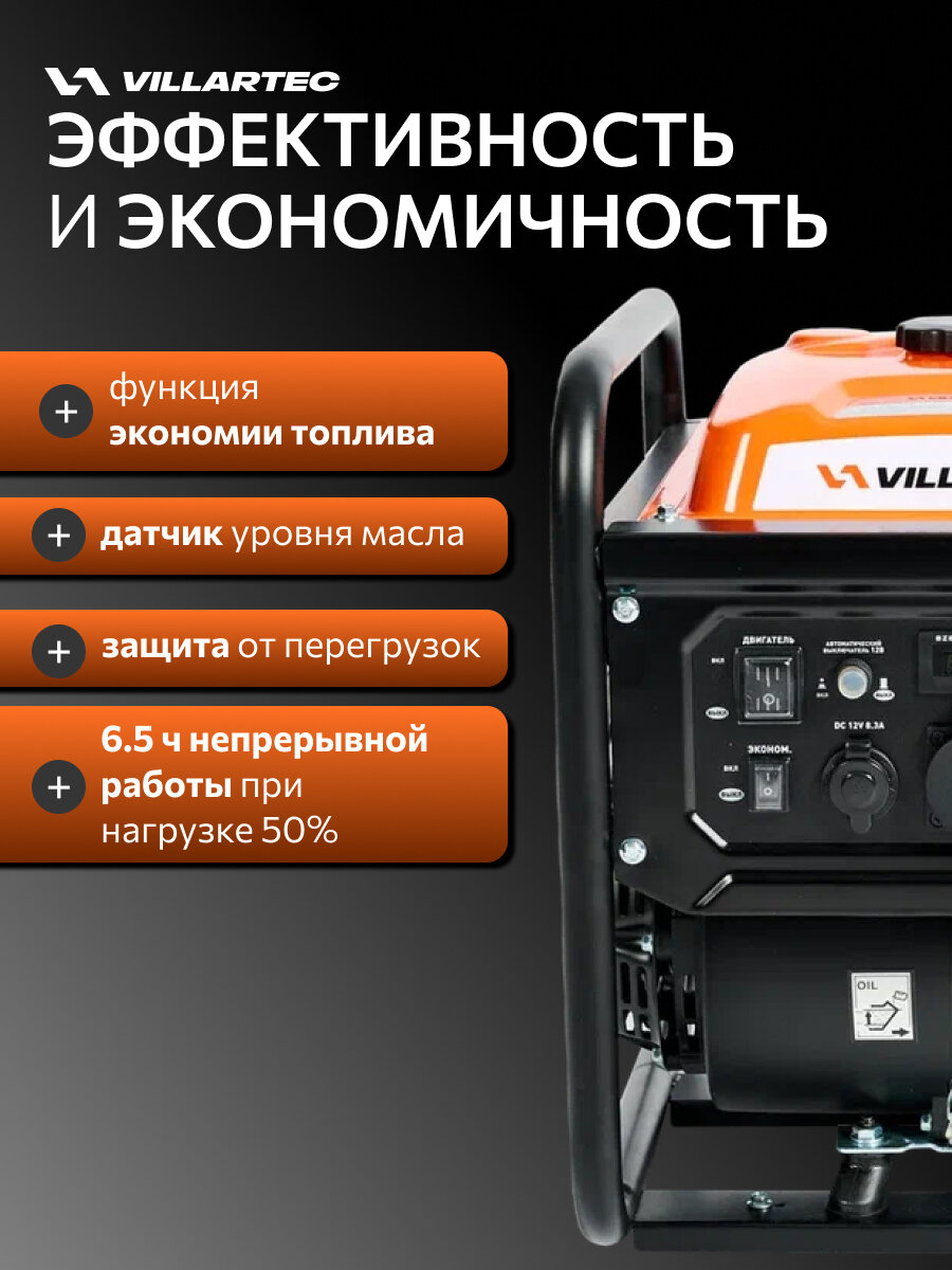 Генератор VILLARTEC также оснащен функцией автоматического отключения при перегрузке, что обеспечивает безопасность использования. По сравнению с обычными бензиновыми генераторами инверторные бесшумны и более мобильны за счет небольшого веса.