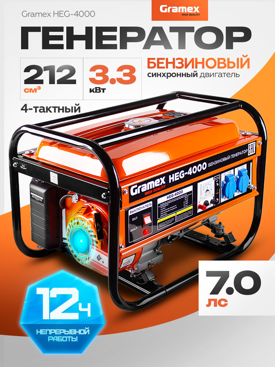 Генератор бензиновый Gramex HEG-4000/ бензогенератор 3.3кВт/ электростанция 230В/ электрогенератор 7.0 л. с.: сравнение цен, характеристики, фото, актуальное наличие и цены.