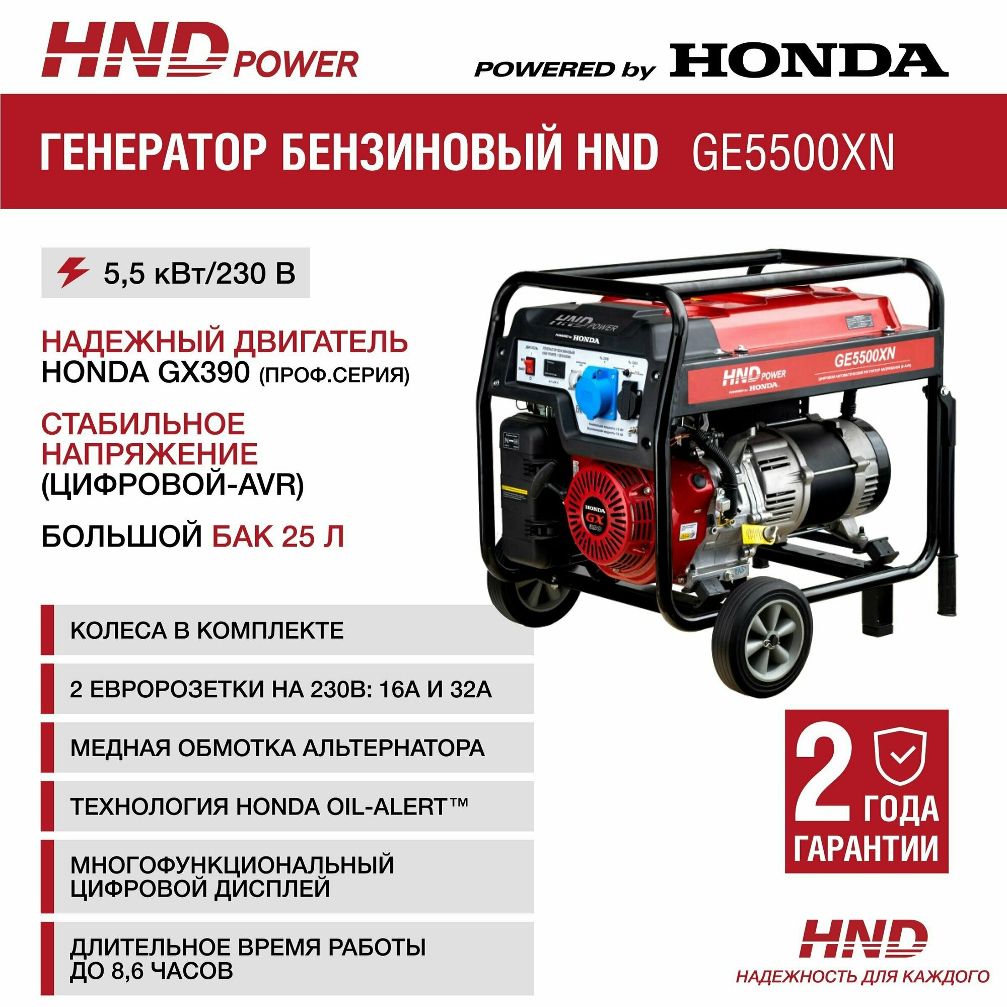 Бензиновый генератор HND GE5500XN с двигателем Honda представляет собой мощную однофазную электростанцию мощностью 5,5 кВт, разработанную для надёжного электроснабжения в условиях отсутствия централизованной сети.