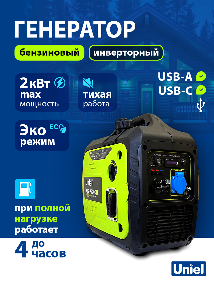Генератор бензиновый инверторный, 2кВт, ручной запуск, мини, переносной, Uniel: сравнение цен, характеристики, фото, актуальное наличие и цены.