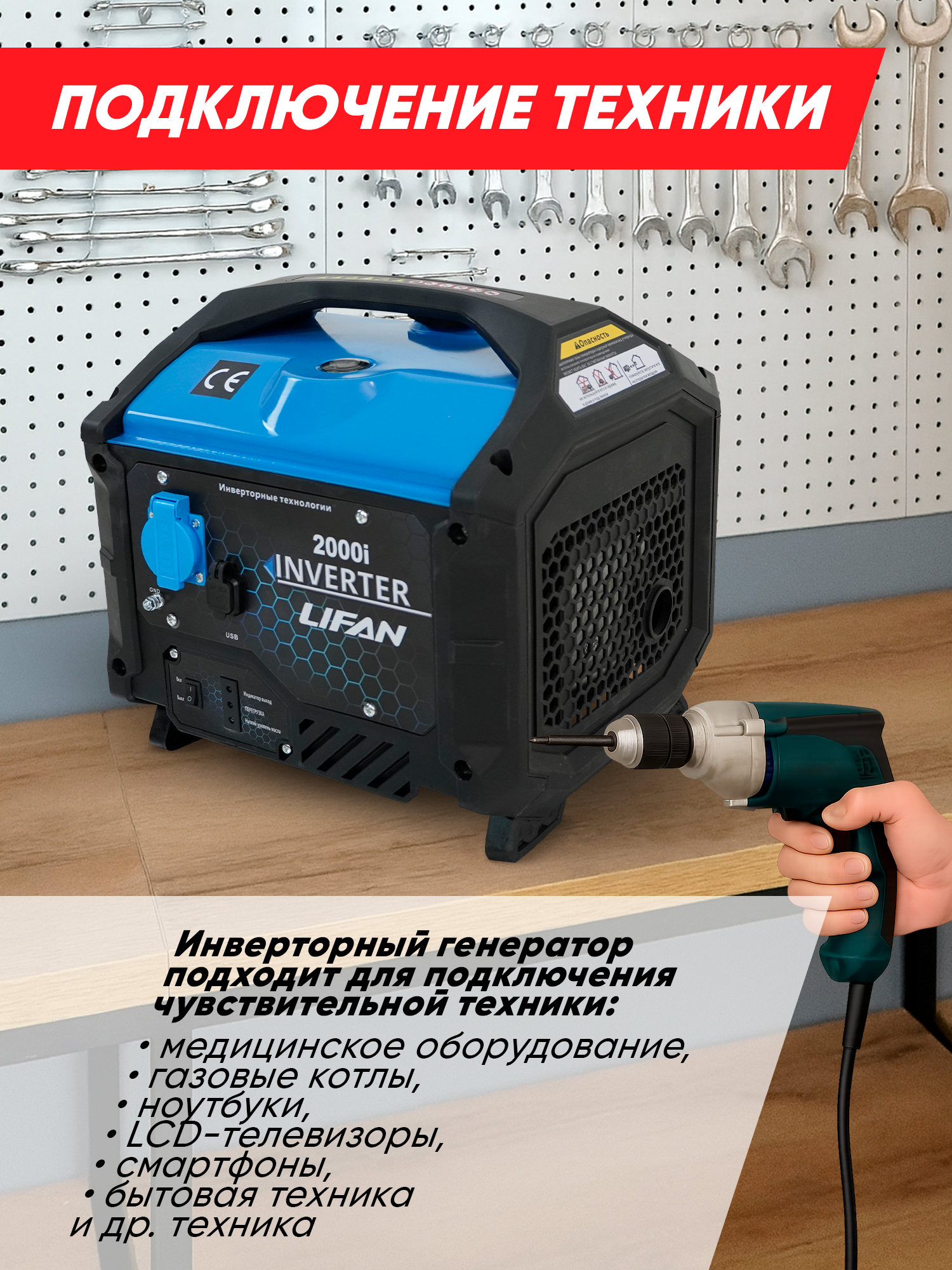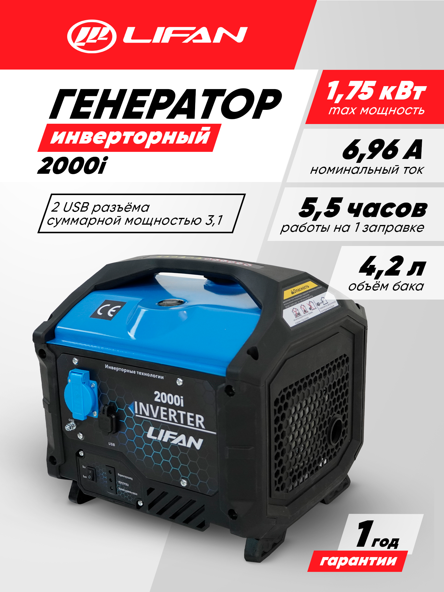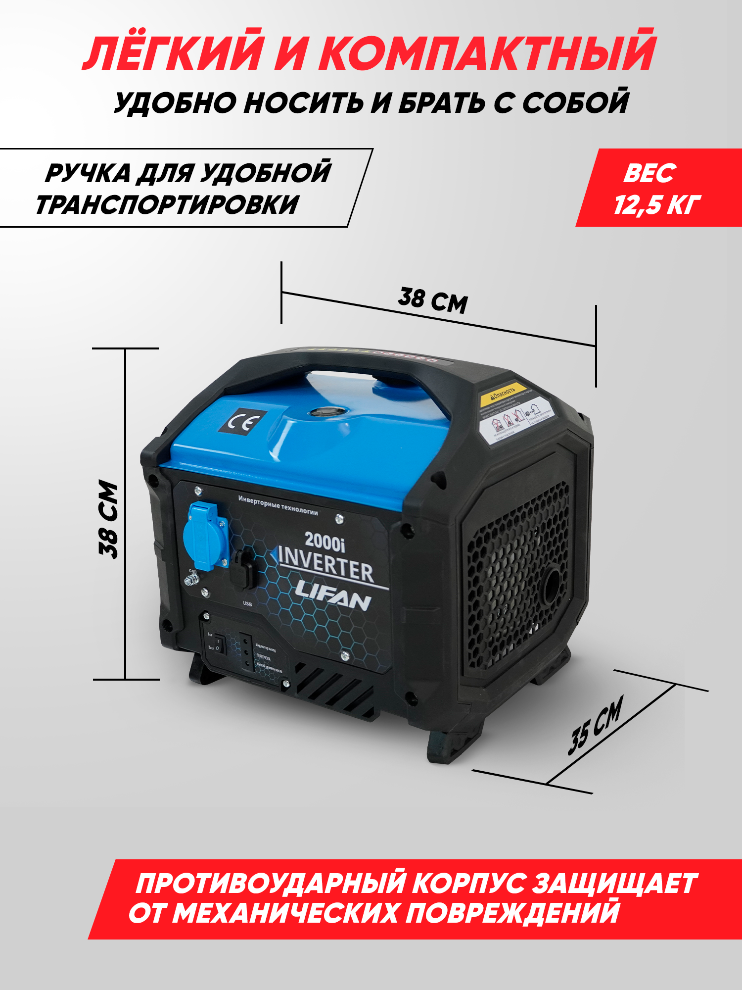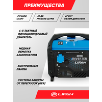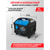 | Особенности | бесщёточный генератор, глушитель, звукоизоляционный кожух, инверторный генератор, колёса |