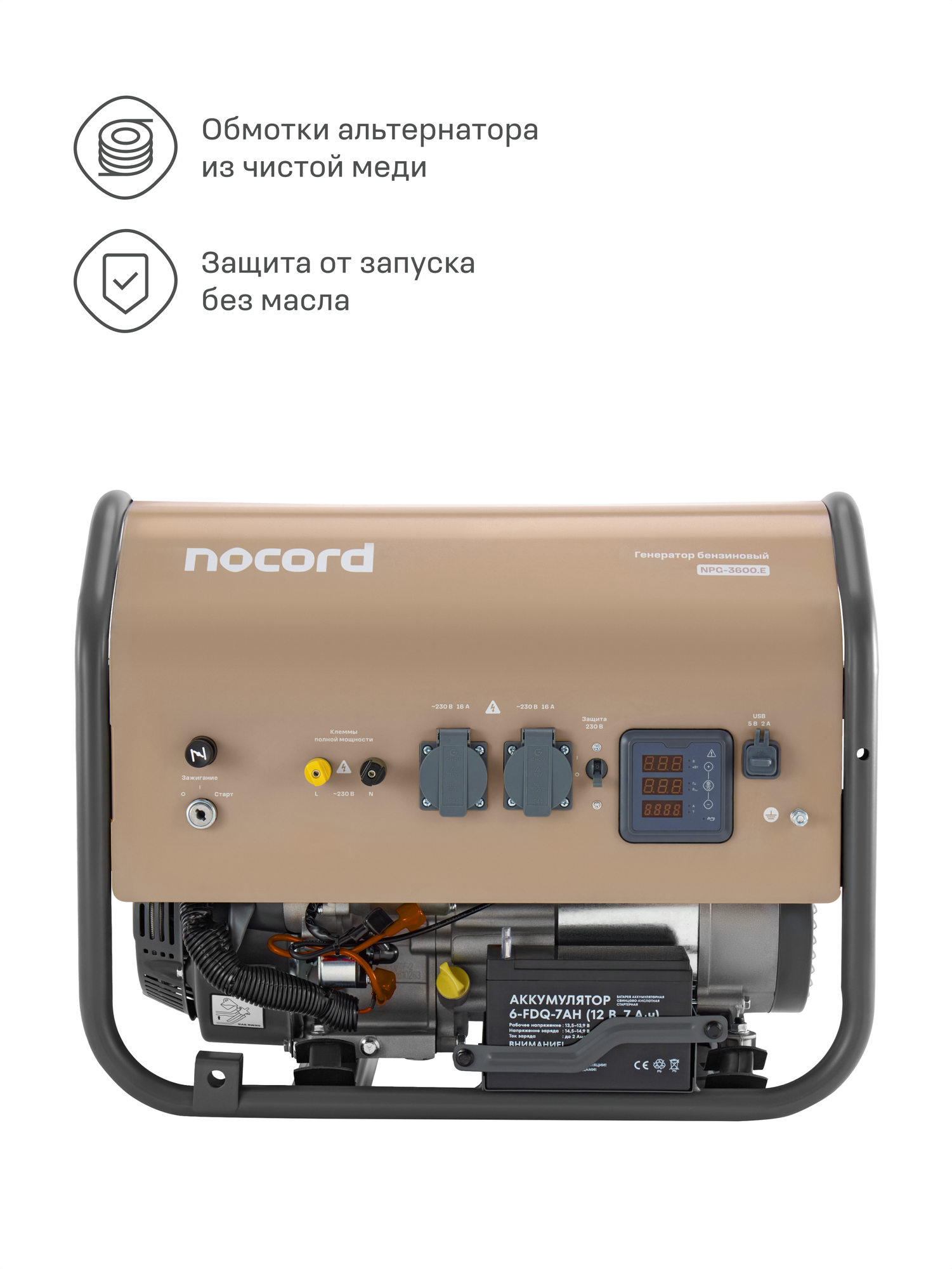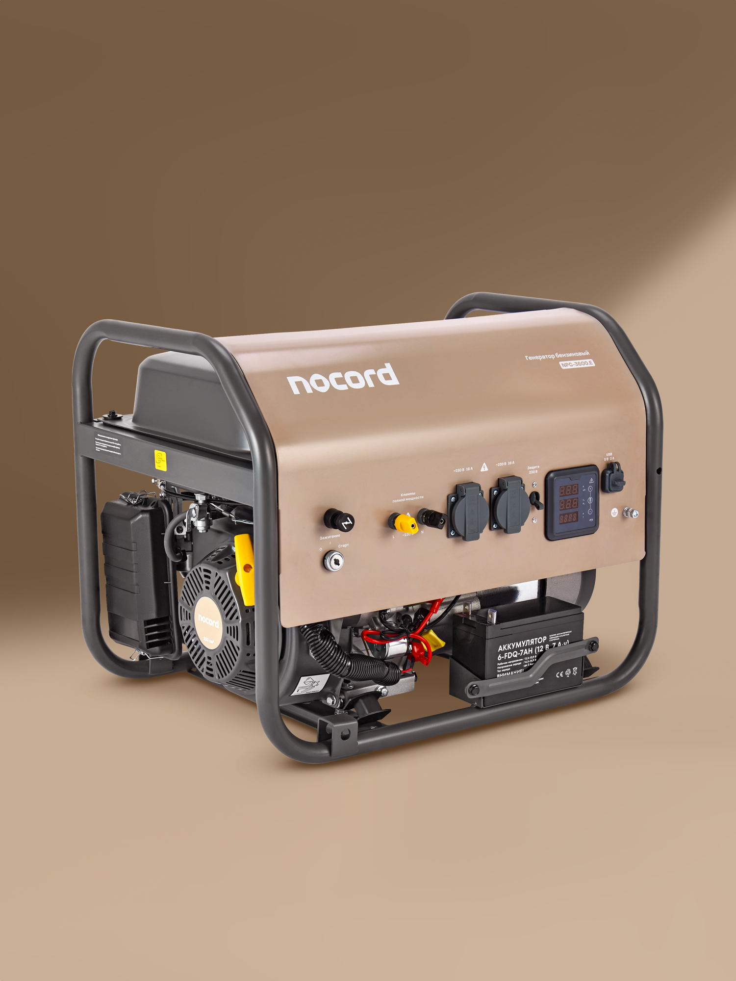 Генератор бензиновый Nocord, 3.6 кВт, электростарт, бак 18 л, 2*16А, клеммы ~230 В, дисплей, медные обмотки, NPG-3600. E: сравнение цен, характеристики, фото, актуальное наличие и цены.