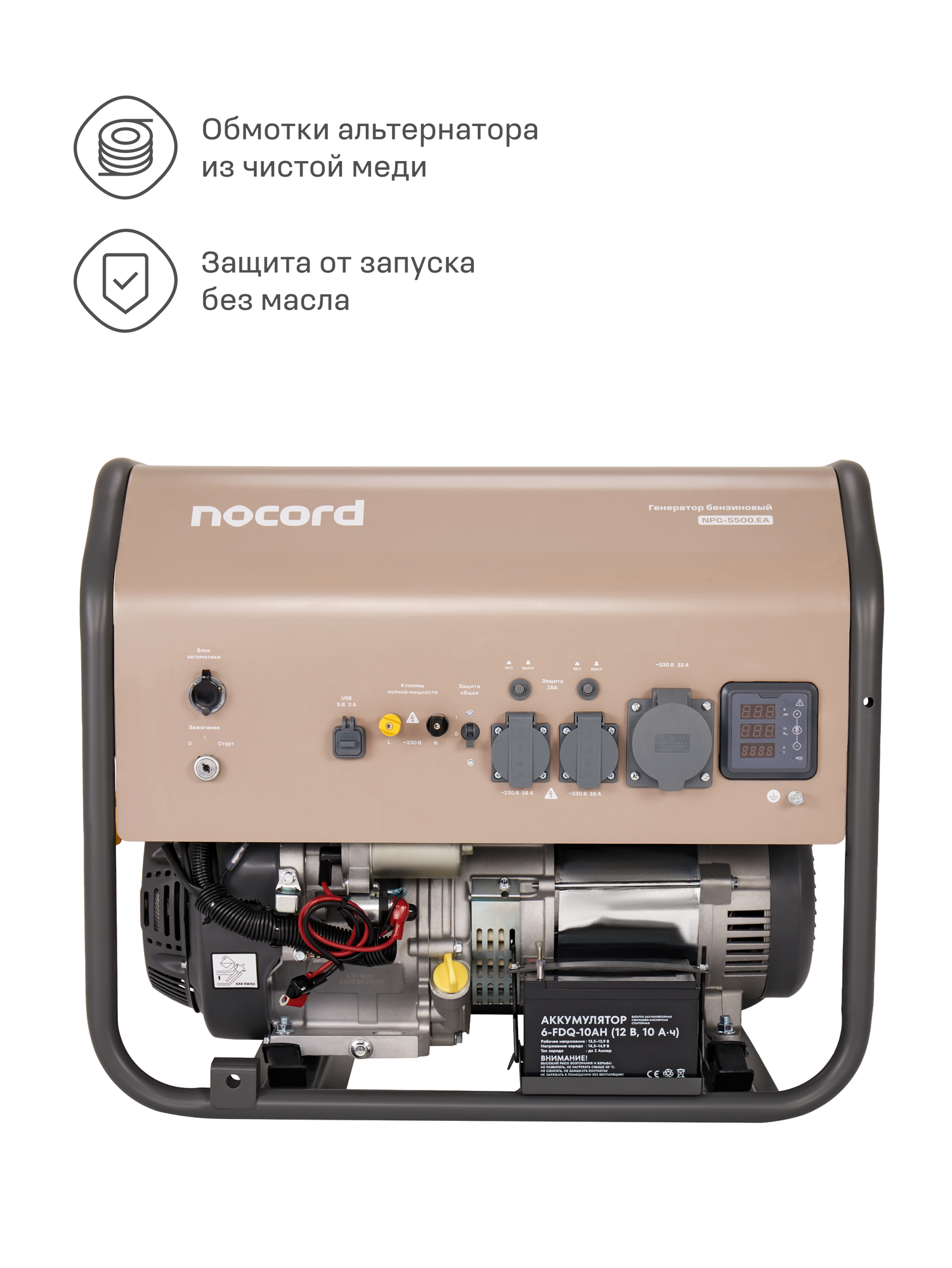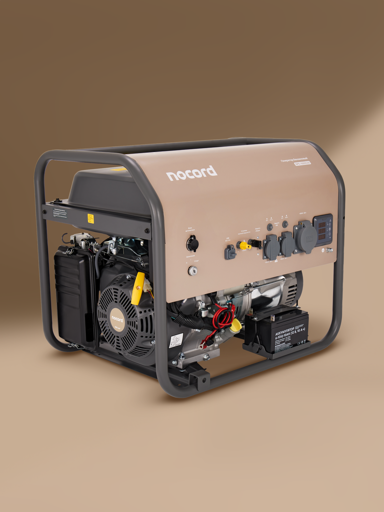 Генератор бензиновый Nocord, 5.5 кВт, е-старт, АВР, 30л, розетки 32А + 2*16А, клеммы ~230 В, дисплей, медь, NPG-5500. EA: сравнение цен, характеристики, фото, актуальное наличие и цены.