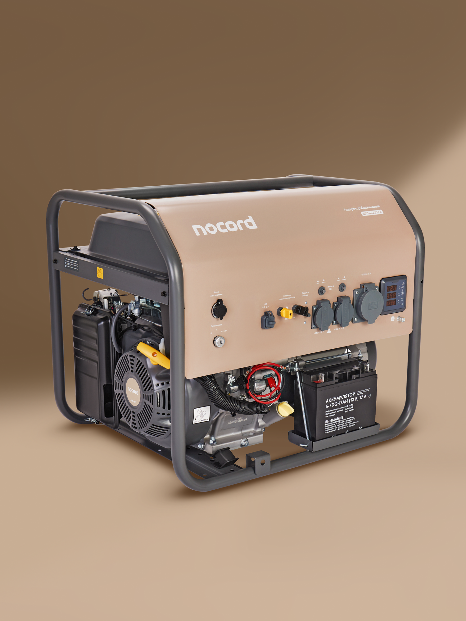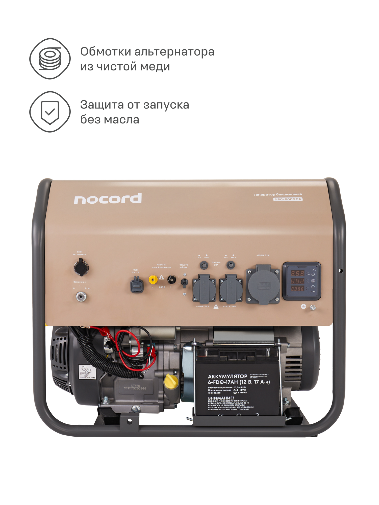 Генератор бензиновый Nocord, 8.3 кВт, Е-старт, АВР, 30л, 32А + 2*16А, клеммы ~230 В, дисплей, медь, колеса, NPG-8000. EA: сравнение цен, характеристики, фото, актуальное наличие и цены.