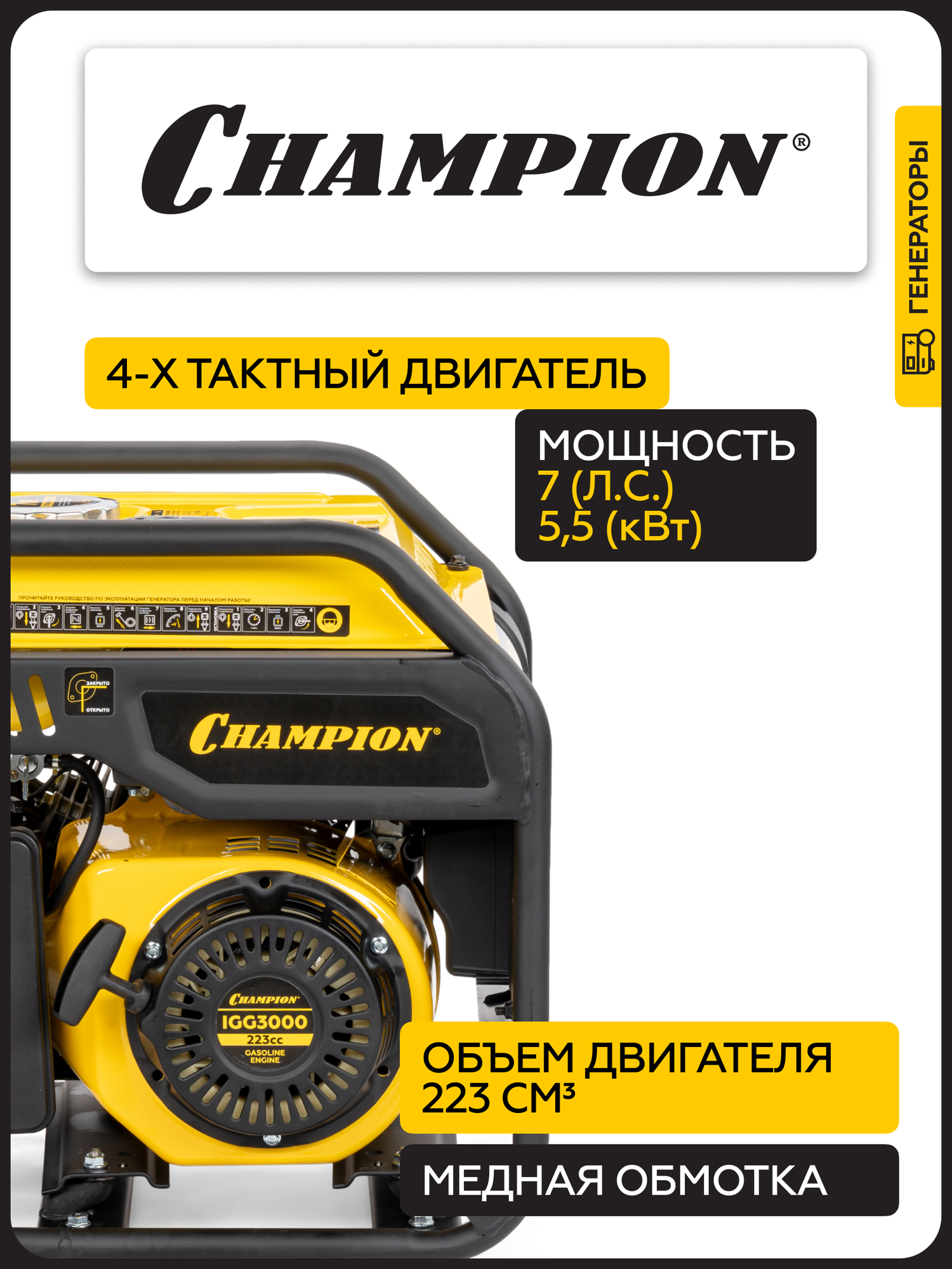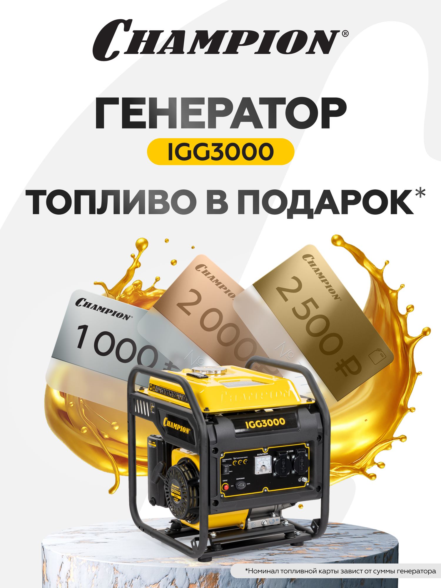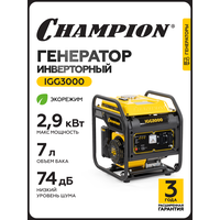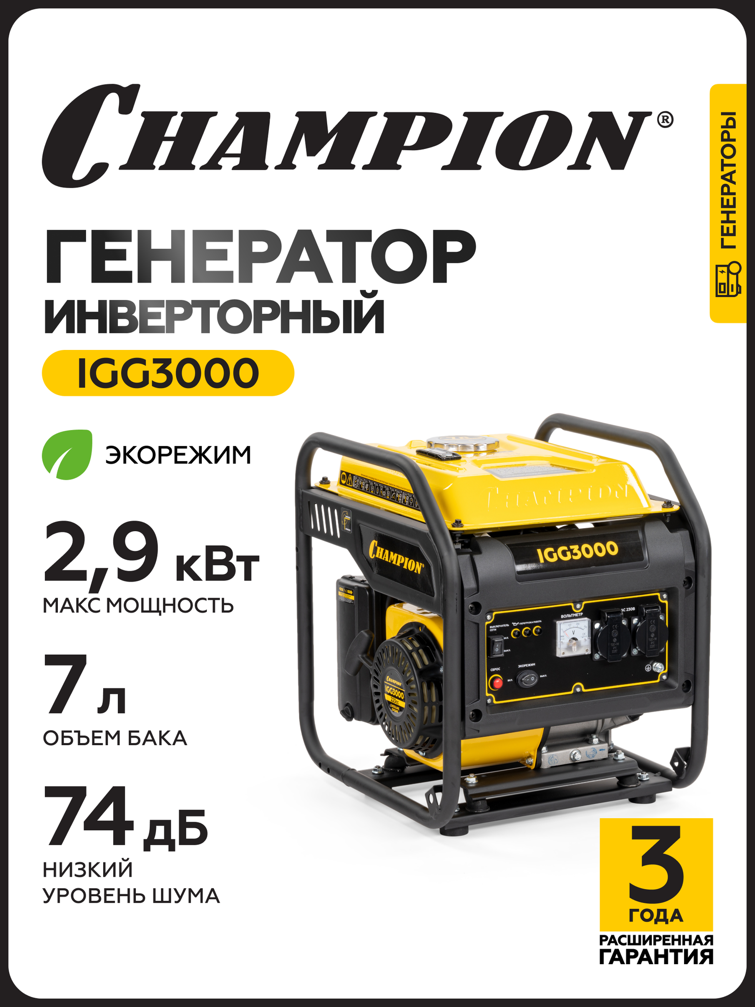 Купить Генератор инверторный CHAMPION IGG3000 (2,8/2,9кВт, 7,5лс, 7л, 26кг) с доставкой по всей России. Генератор инверторный CHAMPION IGG3000 (2,8/2,9кВт, 7,5лс, 7л, 26кг): сравнение цен, характеристики, фото, актуальное наличие и цены.