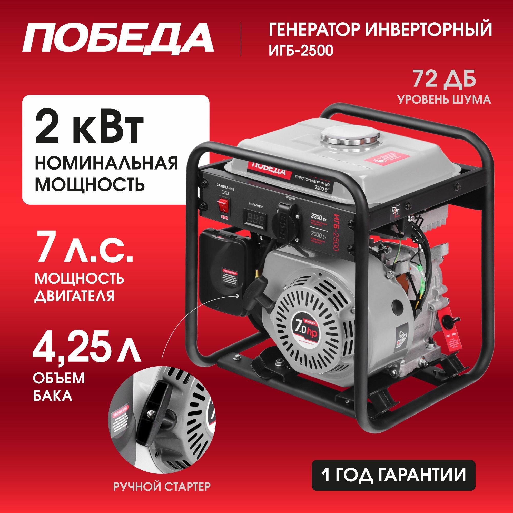 Особенности:- все генераторы ИГБ открытого рамного типа;- во всех моделях 4Т двигатель;- усиленные опорные ножки, что гарантирует низкий уровень вибраций во время работы;- пластиковая крышка защищает контакты розетки;- на передней панели вольтметр;- медная обмотка альтернатора;- отличное качество выходного напряжения. Технические характеристики:• Двигатель: 4-х тактный, АИ-92, 208 куб. см, 7 л. с.• Напряжение: 1 фаза, 220 В, 50 Гц• Мощность ном./макс: 2/2.2 кВт• Объём топливного бака: 4.25 л• Уровень шума: 72 дБ• Стартер: ручной• Вольтметр: стрелочный• Розетки: 1х230В• Исполнение корпуса: открытый• Защита от перегрузки: есть• Индикатор уровня топлива: есть• Датчик уровня масла: есть• Ручка для транспортировки: есть• Гарантия: 1 год• ВхШхГ упаковки: 44х40х35 см• Вес брутто упаковки: 22 кг• Объем упаковки: 0,061600 куб. м• Комплект поставки: генератор, свечной ключ, инструкция по эксплуатации