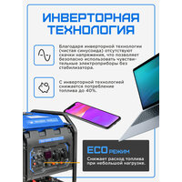 Благодаря использованию в этой модели инверторного преобразователя, на выходе получается стабильный ток, без каких-либо скачков, генератор способен регулировать работу двигателя в зависимости от нагрузки: к примеру, если нагрузка составляет половину от выходной мощности, то и мощность двигателя снижается вдвое; это дает значительную экономию топлива, инверторные модели получаются более легкими и компактными, чем традиционные генераторы. Благодаря двигателю, специально разработанному под инверторный генератор и особенной конструкции корпуса, удалось значительно понизить уровень шума. Режим ECO экономит топливо и увеличивает ресурс двигателя. Выход 12 вольт позволяет подзарядить автомобильный аккумулятор в экстренном случае. Инверторный генератор считается оптимальным выбором для нагрузки, чувствительной к качеству тока — такой, как аудиотехника или телевизор. Разъем параллельной работы позволяет суммарно увеличить выходную электрическую мощность, подключив 2 электростанции вместе с помощью дополнительного устройства - уприг.