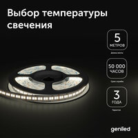 Светодиодные ленты Geniled универсальны в применении и просты в монтаже. Благодаря меткам на поверхности резать ленту легко и просто. Самоклеящаяся основа позволяет надежно закрепить ленту на любой гладкой поверхности. Преимущества: — Высокий индекс цветопередачи 82Ra обеспечивает правильное, без искажений, восприятие цветов освещаемых предметов. Качественное освещение положительно влияет на здоровье глаз и самочувствие. — Низкое напряжение питания 12В обеспечивает безопасность использования. — Рабочая температура эксплуатации от -40°С до +60°С. — Срок службы 50 000 часов. — Гарантия 2 года. Внутри упаковки – инструкция по подключению.