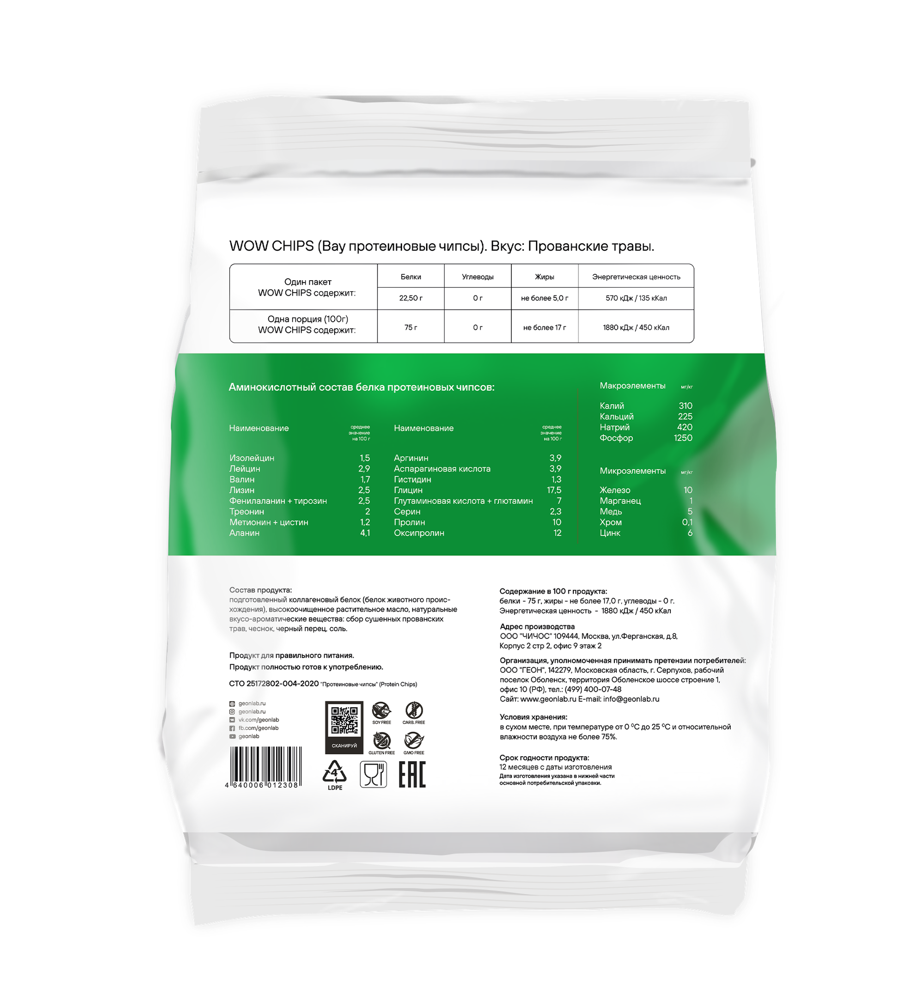 WOW Chips это 75% белка, 0% углеводов и менее 15% жира. Состав новых чипсов от GEON уникален. При их изготовлении не используются соя, а тем более — крахмал, они не содержат ни глютена, ни сахара, ни лактозы. WOW Chips — идеально подходят для тех, кто заботится о сохранении фигуры или хочет привести ее в порядок, но при этом не отказывать себе в радости съесть «что-то вкусненькое».