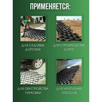 Георешетка с перфорацией 21х21х10см, модуль 2,5х6,21=15,5м2. Георешетка модульный геосинтетик, изготовленный из скрепленных между собой полимерных полос. В развернутом виде модуль объемной георешетки имеет конструкцию сот. Применение: стабилизация сыпучих материалы (не допустить осыпания склона, повысить прочность дорожного полотна, продлить срок эксплуатации различных сооружений из грунта); при строительстве транспортных путей; для коррекции береговых линий водоемов (рек, озер, прудов ); при обустройстве высоких клумб; для армирования водоотводов. За счет большого количества ячеек георешетка уменьшает подвижность грунта, предотвращая его сползание. Склоны и откосы, укрепленные решеткой, не размываются осадками и не дают проседания. Укрепление склонов георешеткой не даст разрастаться оврагу, а ручью размыть берега. Преимущества данной георешетки: высокая прочностью на разрыв; устойчивостью к нагрузкам динамического характера; устойчивость к образованию коррозии; устойчивость к поражению грибком и плесенью; хорошо переносят высокие и низкие температуры; сохраняют целостность при резких температурных перепадах; просто монтируются. Основные преимущества: -Армирование. -Надежное укрепление грунтовых конструкций -Разделение несущих слоев сооружения -Противоэрозийные действия. Для заполнения решетки используют: каменную крошку; песок; гравий; грунт (с растениями или без них); растворы бетона, которые в дальнейшем застывают, образуя прочное основание. Георешетку можно использовать между грядок в теплице как дорожку. Засыпать ее землей или щебнем. Решеткой удобно декорировать площадки возле клумб и мест отдыха. георешетка; укрепление; армирование; для дачи; для сада; садовая дорожка; георешетка объемная; бордюрная лента