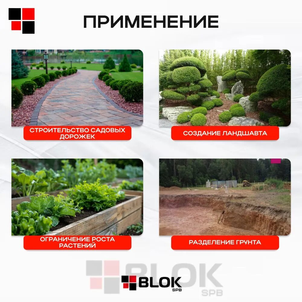 рекомендуется применять при создании ландшафта. Допустимо применение при обустройстве садовых дорожек и для разделения грунта и декоративных материалов.
