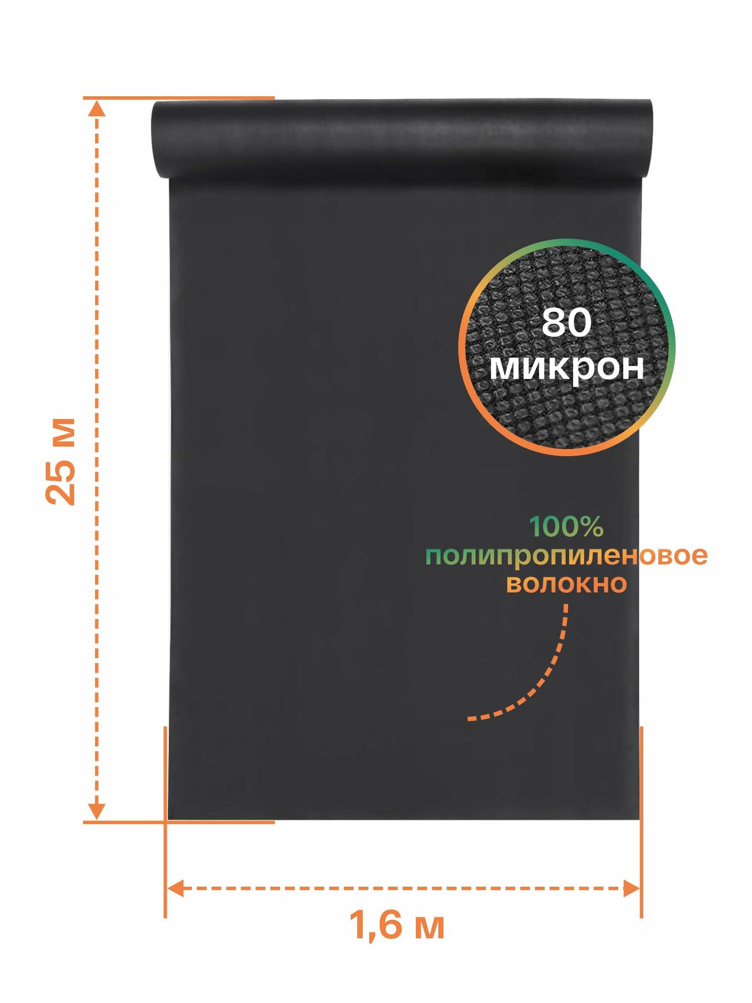 Геотекстиль садовый, 80 микрон, 1,6х25 м, чёрный, от сорняков, для грядок, для дорожек и ландшафтных работ