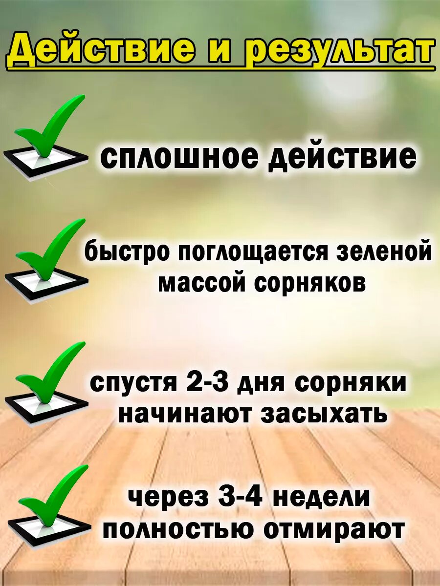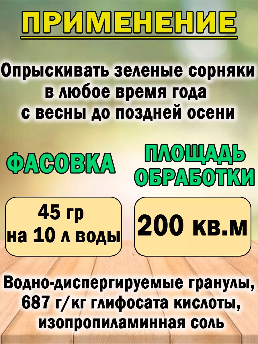Упаковка содержит 45 грамм гербицида, что достаточно для обработки 500 квадратных метров.