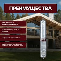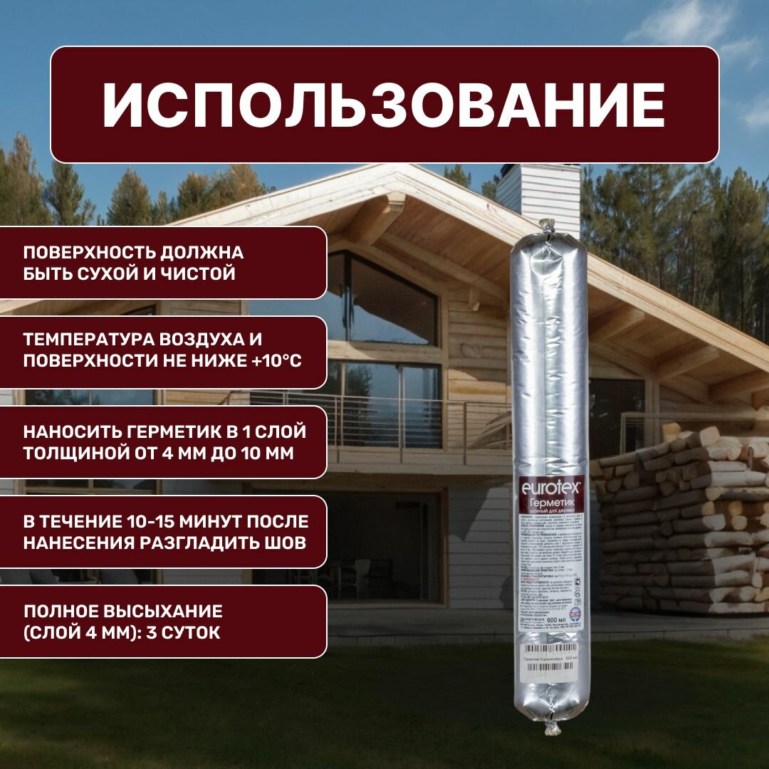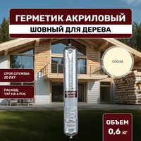 Герметик акриловый шовный для дерева Eurotex 0,6л. Назначение: герметизация межвенцовых и монтажных швов и щелей в различных деревянных конструкциях. Герметизация различных трещин (торцевых, боковых) в бревнах и брусе. Герметизация оконных и дверных рам, плинтусов, наличников, переплетов и пр. применение: Применяется внутри и снаружи помещений по деревянным поверхностям и материалам на основе древесины (ДВП, ДСП, фанера и др.). Допускается использование для герметизации стыков сборных бетонных, газобетонных и кирпичных конструкций при соблюдении технологии нанесения. Свойства: оптимальная эластичность (коэффициент удлинения до 200%) и высокая прочность на разрыв: выдерживает естественные подвижки сруба, не растрескивается и не отслаивается. Высокая теплоизолирующая способность и паропроницаемость. Отличная адгезия к любым деревянным поверхностям. Пластичность: красивый аккуратный шов вогнутой, прямой или выпуклой формы. При заделке трещин предотвращает их дальнейшее развитие. Устойчив к образованию и распространению плесени и грибка. Расход в 1 слой1 кг на 6 п. м. при толщине шва 4-6мм и ширине 10мм. Цвет: 6 цветов: сосна, палисандр, орех, калужница, груша, белый. Колеровка ручная: универсальными колерными пастами или колеровочными красками.