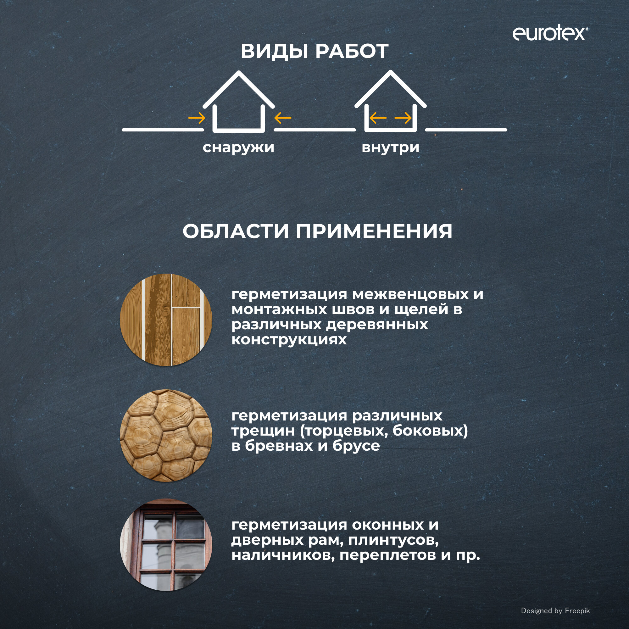 - обладает высокой эластичностью: выдерживает естественные подвижки сруба, не растрескивается, не отслаивается,