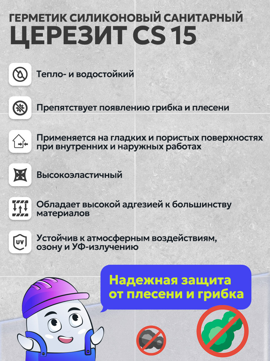 Герметик силиконовый санитарный CS 15 Церезит (Ceresit) имеет превосходную адгезию ко всем видам керамических плиток, фарфору, фаянсу, стеклу, эмалированным поверхностям и т. д. без предварительного грунтования. Герметик кислотного отверждения.