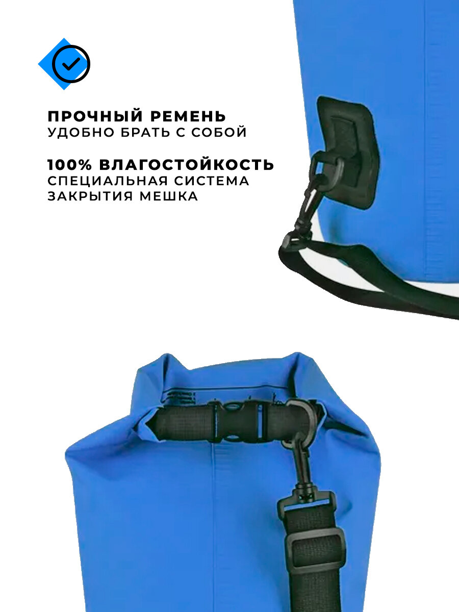 Герметичный мешок на 60 литров из прочной ткани ПВХ полностью защищает от любого попадания влаги, пыли, грязи или песка и сохраняет вещи во время активного отдыха. Герметичная сумка-мешок для всех видов активного отдыха – каякинга, сёрфинга, рыбалки, сапбординга, рафтинга, гермомешок в поход и на природу, на пляж, на кемпинг, на пикник, на море, в поездки на велосипеде и путешествия. Герметичная сумка незаменима в водном туризме и для набора выживания. Вы можете брать Dry Bag, не боясь попасть под дождь, намочить вещи и не беспокоясь о сохранении вещей. Туристический гермомешок подойдёт для хранения вещей в обычных условиях (прогулки, пикники и т. д.). Удобен как герморюкзак для грибника, для рыбалки (лёгкий кан для рыбы) и охоты (влагозащищённая сумка для мяса). Часто покупают как герметичную хозяйственную сумку-мешок, рюкзак для бассейна под обувь и бельё, велорюкзак и велосумку на багажник велосипеда и мотоцикла, для занятий спортом, кроссфитом, йогой.