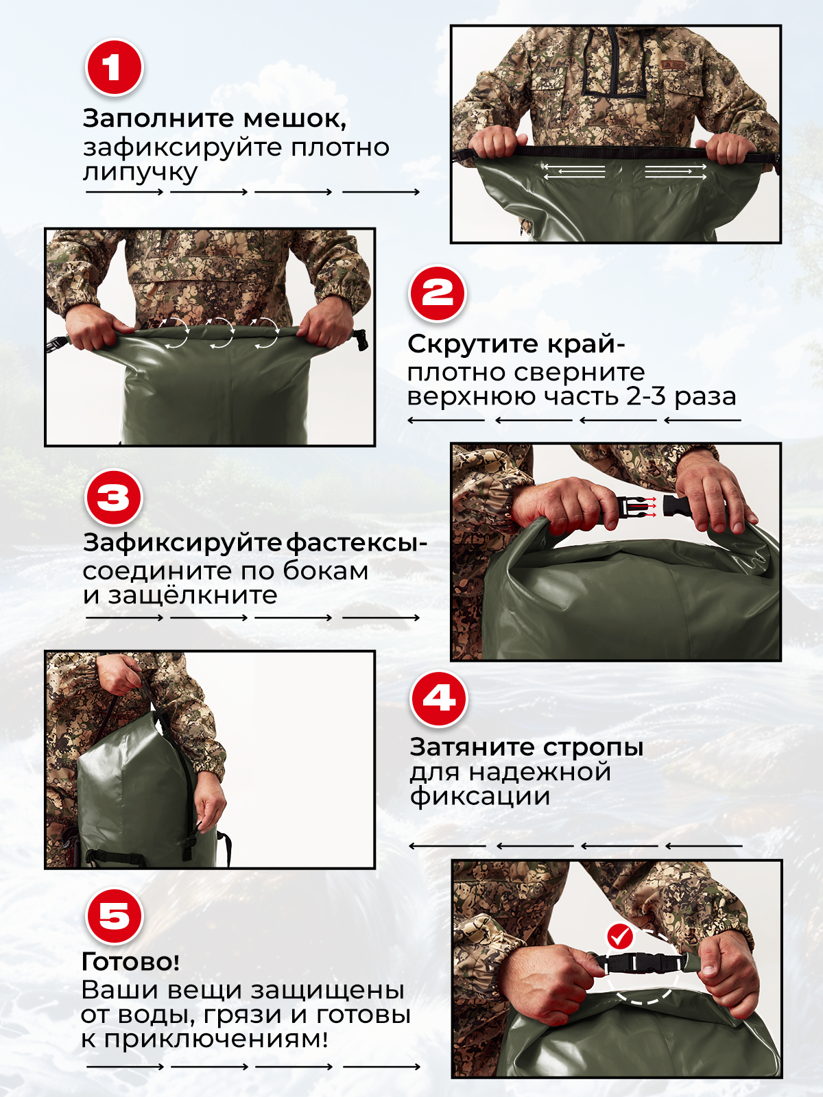 Гермомешок - отличный мешок для сплава, известен как драйбег для рыбалки, туризма. Герморюкзак от производителя. Благодаря собственному производству мы обеспечиваем покупателей товарами высокого качества по доступной цене! Гермомешок для рыбалки из ПВХ абсолютно водонепроницаем, проклеенные швы гарантируют сухость ваших вещей в любую погоду и в любых условиях. Особенно актуален гермобаул на сплавах. Через сложенную в несколько раз горловину гермомешка, не просочится влага, потому что плотно прижатые друг к другу гладкие внутренние стенки надежно перекрывают все пути сырости. Верх драйбега фиксируется на липучку и фастекс. Даже если лодка перевернется, будьте спокойны за состояние своих вещей. У драйбега сварные швы на импортном оборудовании методом горячего клина из качественной ткани с 2-х сторонним пвх-покрытием, плотностью 630 гр./м. кв. К плюсам материала также можно добавить эластичность при отрицательных температурах. Ветки и сучья не способны повредить толстый и прочный ПВХ, поэтому влага внутрь не проникнет. Гермомешок имеет 2 формованные лямки крепящиеся на мешок при помощи строп и пряжек. Лямки, позволяют грузить его значительно больше, чем обычные гермоупаковки и значительно облегчают переноску груженого мешка. Более того, за счёт удобных анатомичных лямок, драйбег можно использовать как обычный рюкзак. Особенности: У гермомешков размерами 50 л, 90л. и 120л. лямки съемные. У гермомешка на 130 л. лямки не съемные, но он оснащен дополнительными стропами для крепления к нему дополнительного оборудования (туристический коврик и тд.) или крепления самого гермобаула к лодке или катамарану. размеры: 50 литров - высота 94 см, диаметр дна 31 см, вес 900 г. 90 литров - высота 115 см, диаметр дна 34 см, вес 1200 г. 120 литров - высота 119 см, диаметр дна 39 см, вес 1300 г. 130 литров - высота 119 см, диаметр дна 42 см, вес 1500 г.