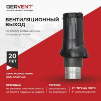 Вентиляционный выход GERVENT является частью вентиляционной системы. Устанавливается через проходной элемент на кровлю, сверху фиксируется саморезами нанодефлектор. Вентиляционный выход изготовлен из АБС-пластика. Уплотнитель обеспечивает теплоизоляцию и препятствует обмерзанию трубы даже во время длительных морозов и образованию конденсата. Преимущества: • не боится экстремальных погодных условий • не боится падений и ударов • не ржавеет и не окисляется • отличный внешний вид • хорошо сбалансирован • увеличенный срок службы, 10 лет • точная регулировка по вертикали.