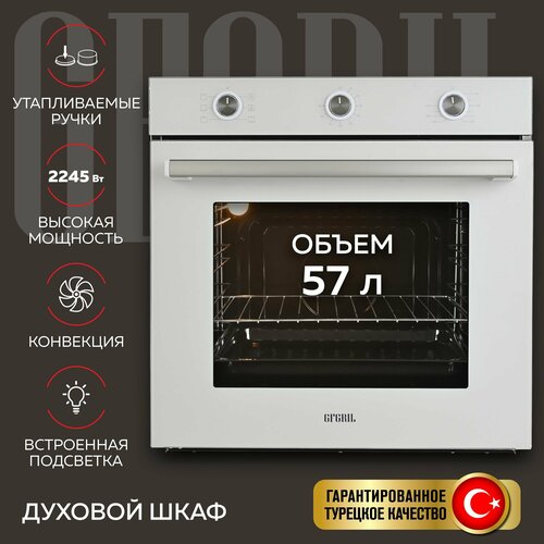 Духовой шкаф GF-EO300W это современное многофункциональное устройство для кухни, благодаря многообразию режимов которого Вы можете приготовить не только повседневную пищу, но и много более сложных и разнообразных блюд. Объем духовки 76 литров позволяет разместить объемные блюда, а также готовить на нескольких уровнях одновременно. Духовка электрическая снабжена функциями конвекции, что позволяет блюду равномерно приготовиться со всех сторон, и гриля, который обеспечит хрустящую корочку Вашего блюда. Вы можете с легкостью выбрать один из 6 режимов, температуру от 50 до 250 С и время приготовления от 10 до 90 минут при помощи утапливаемых поворотных регуляторов, а встроенная подсветка позволит наблюдать за процессом, не открывая часто дверцу шкафа, сохраняя температуру внутри. По истечении установленного времени таймер оповестит Вас об окончании процесса приготовления звуковым сигналом. Съемная откидная дверца со съемным двойным стеклом исключает вероятность получения ожогов при прикосновении к ней, лучше сохраняет температуру внутри духовки электрической и позволяет наблюдать за процессом готовки. Мощность встроенного шкафа 2 245 Ватт и класс энергоэффективности А позволяют разумно расходовать электроэнергию. Оптимальный размер (566х595х595 мм) духового шкафа встраиваемого электрического и независимая конструкция позволят разместить электродуховку под столешницу или в шкаф, независимо от расположения варочной поверхности. Духовой шкаф GF-EO300W отличается классическим стилем, благодаря чему отлично впишется в любой современный интерьер кухни. Эмалевое покрытие внутренней камеры духовки электрической для кухни не впитывает запахи и остатки пищи. По окончании приготовления достаточно просто протереть поверхность духовки салфеткой или губкой, что обеспечивает простой уход и очистку духового шкафа. Духовой шкаф электрический встраиваемый GFGRIL GF-EO300W - это высокотехнологичное решение для любой кухни