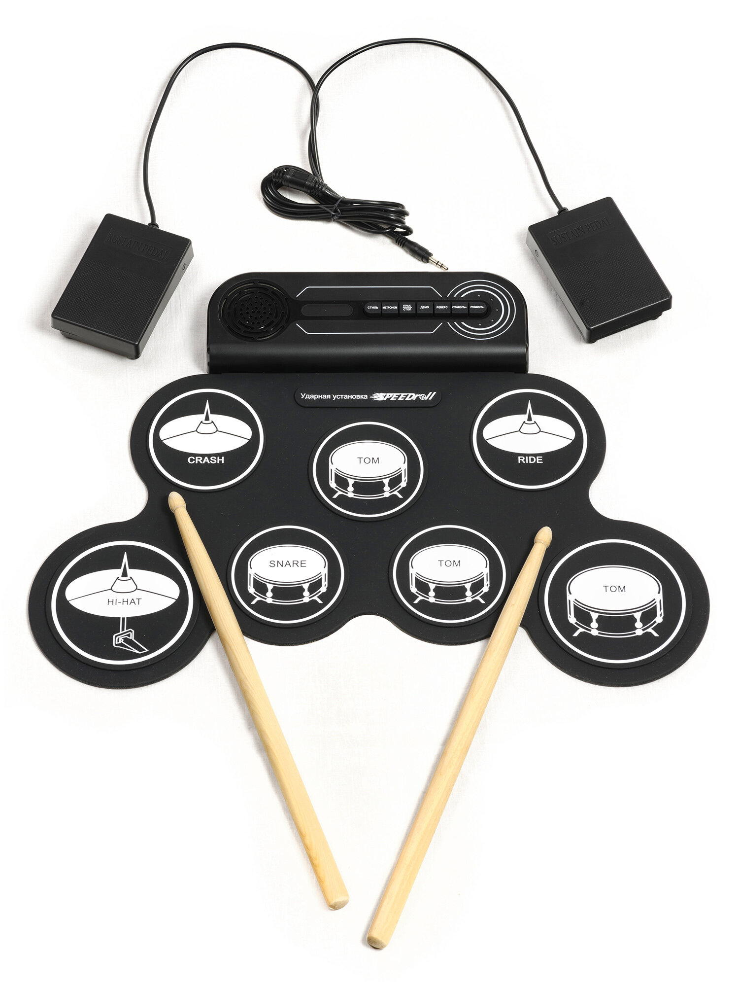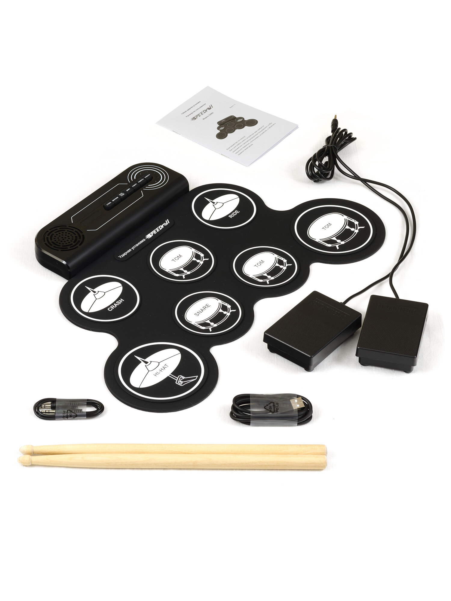 барабанные палочки – 2 шт, кабель для подключения к сети, педали – 2 шт, руководство пользователя