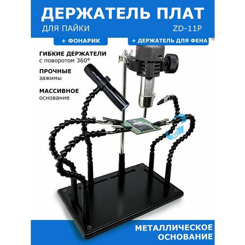 Купить Гибкий держатель для пайки плат третья рука (4 зажима) с подсветкой и держателям фена Zhongdi ZD-11P с доставкой по всей России. Гибкий держатель для пайки плат третья рука (4 зажима) с подсветкой и держателям фена Zhongdi ZD-11P: сравнение цен, характеристики, фото, актуальное наличие и цены.