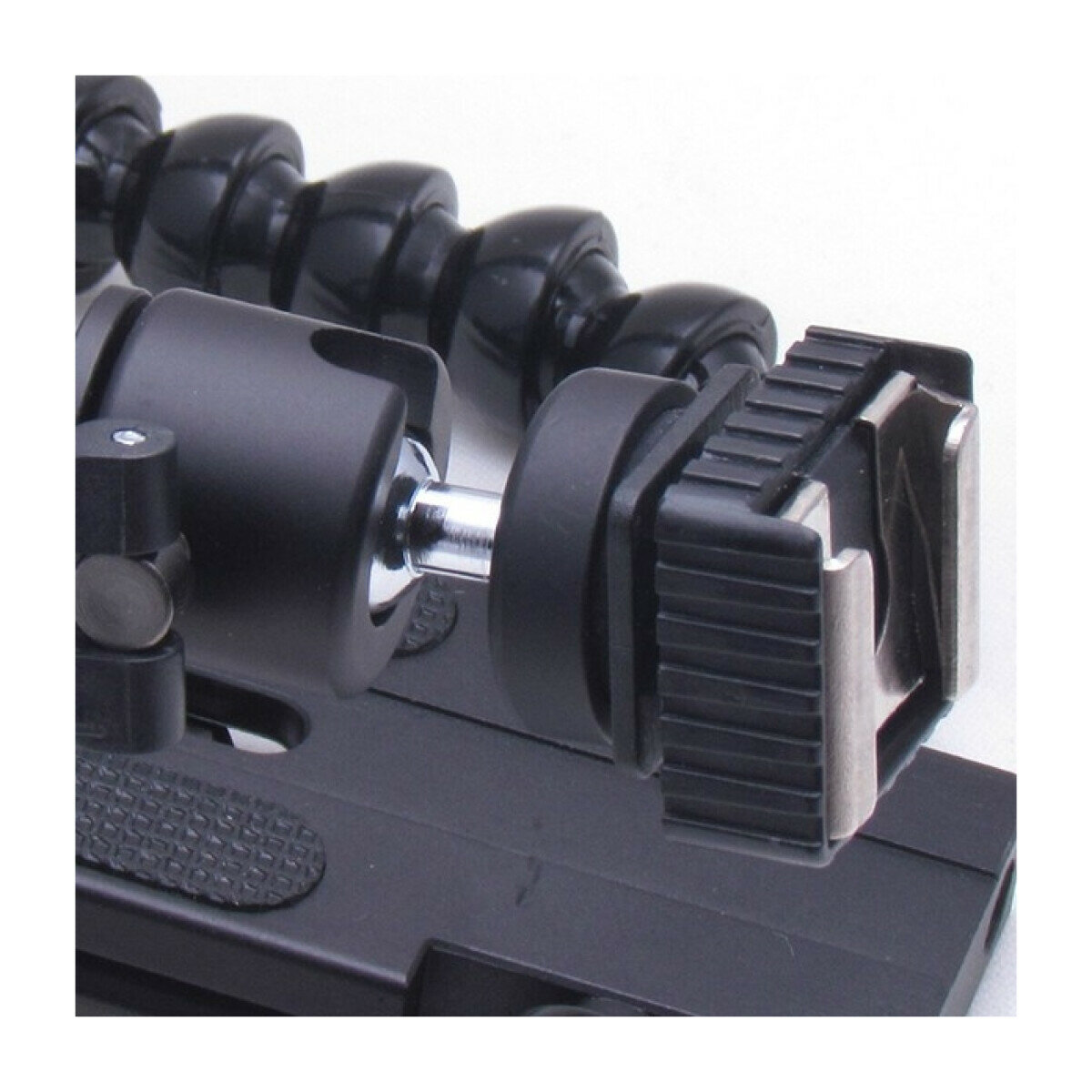 Держатель крепится к камере стандартным винтом с резьбой 1/4" и предназначен для одновременного размещения двух вспышек на камере. Изготовлен из алюминиевого сплава, имеет два крепления холодный башмак, расположенных на мини-шаровых головах, за счет которых вспышки можно устанавливать почти в любое положение.