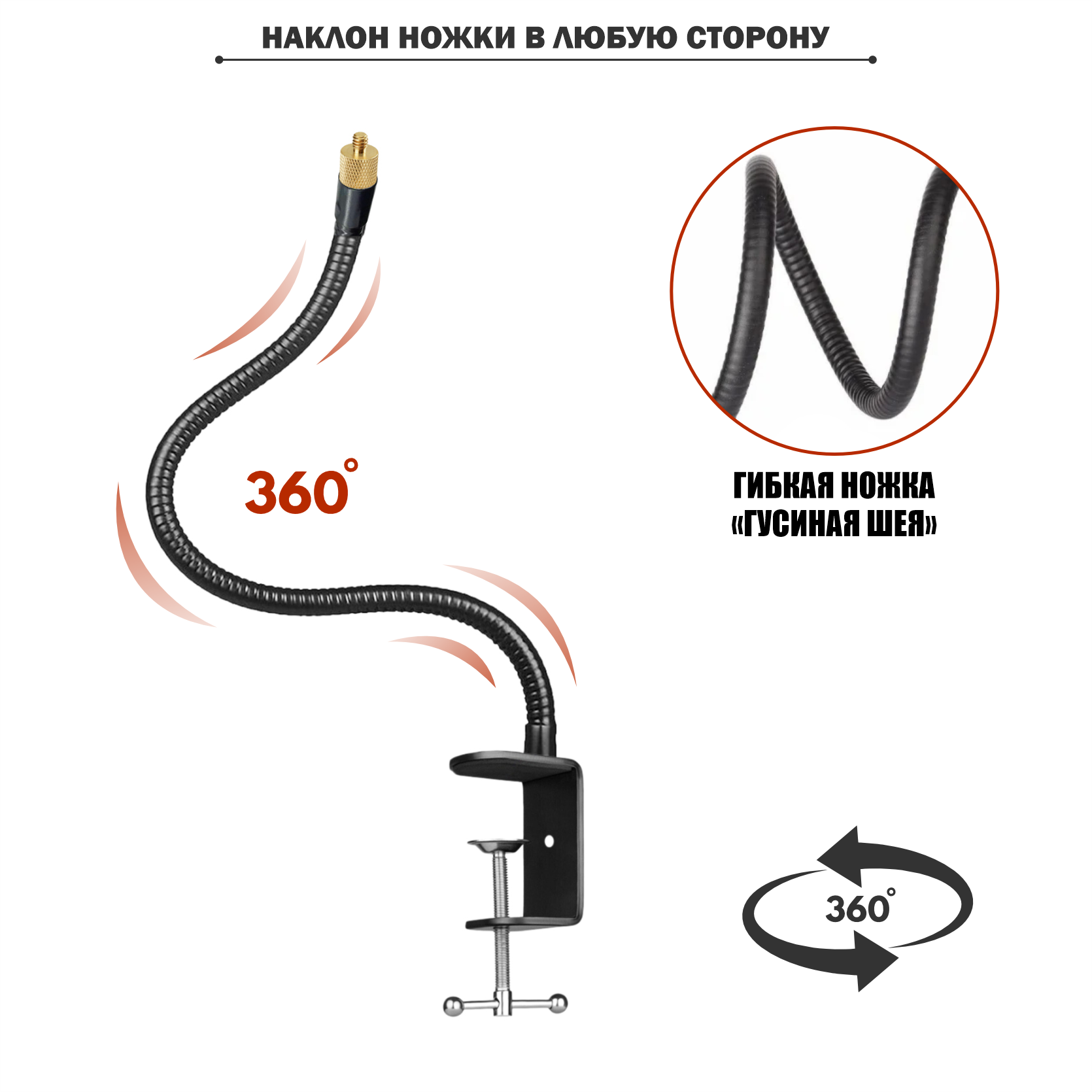 Гибкий держатель GDS-14 крепление для камер на струбцине, резьба 1/4 это удобное крепление для камеры на гибкой ножке обеспечит комфортную фиксацию Вашего устройства на столе или другой поверхности толщиной до 4,5 см. Струбцина надежно крепится к поверхности, фиксируя оборудование в удобном положении. Главная особенность данной модели - возможность установить устройство в любом положении, которое регулируется гибкой ножкой держателя. Вы можете, освободив руки, снимать тик ток, рилс, вести стрим, находить комфортный ракурс съемки легко, не прилагая больших усилий.