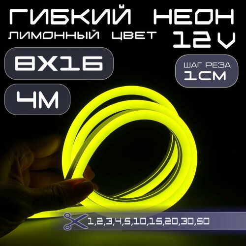 Представляем вам Гибкий неон мощностью 10W и напряжением 12V лимонного цвета , размером сечения 8х16, количество светодиодов 110 LED/M, шаг реза 10мм.