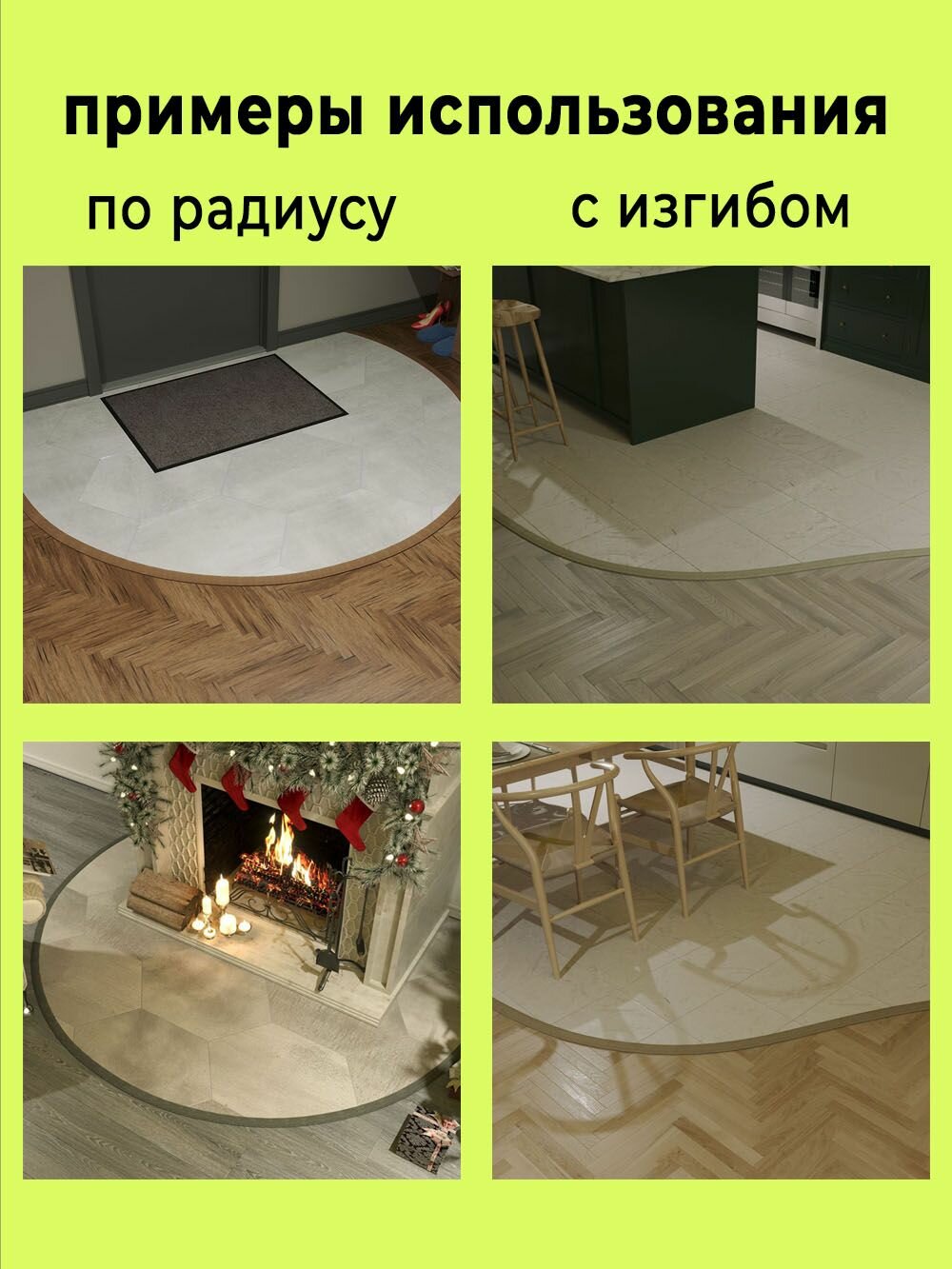 Гибкий порог со скрытым крепежом изготовлен из термопластичного ПВХ. Пластичный материал обеспечивает закрытие закруглённых стыков напольных покрытий с радиусом не менее 0,7 метра.