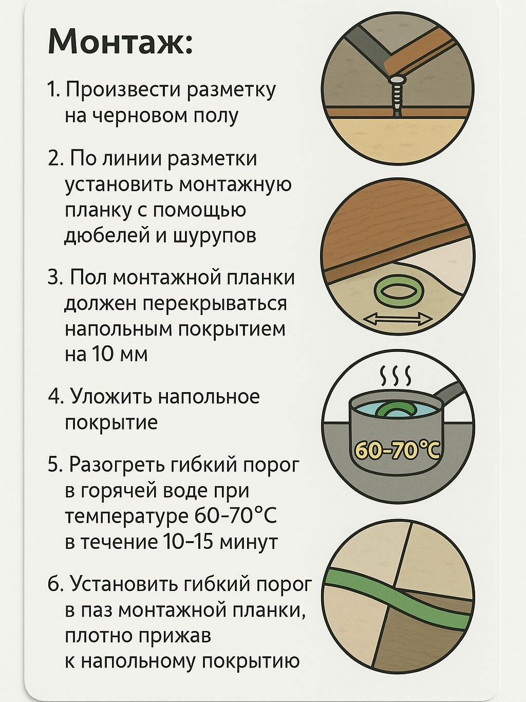 - Разогреть гибкий порог в горячей воде при температуре 60-70ºС в течение 10-15 минут;