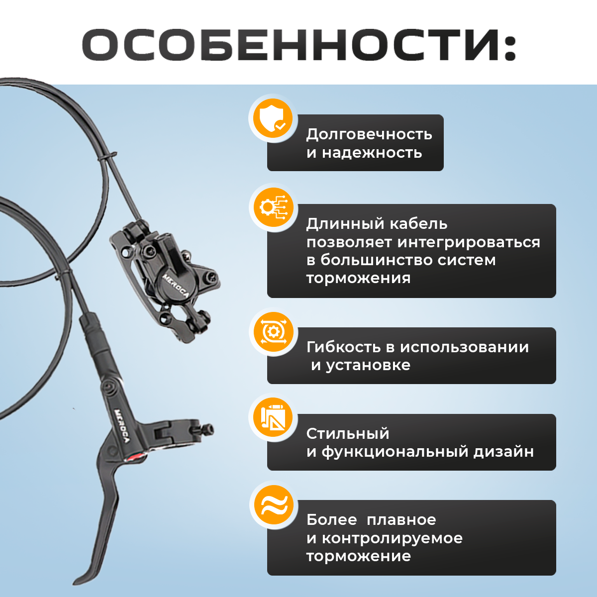 "Гидравлический дисковый тормоз Merocа для велосипеда будет полезен как для профессиональных велосипедистов, так и любителей. Одной из главных особенностей велозапчасти Merocа является использование гидравлической системы, которая обеспечивает более быструю и точную передачу силы торможения. Другим важным преимуществом тормоза на велосипед Meroco является его конструкция, обеспечивающая высокую степень надежности и долговечности.