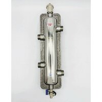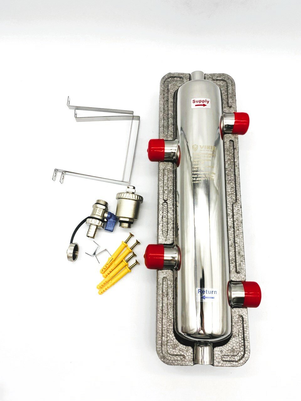 - Укомплектован автоматическим воздухоотводчиком, сливным краном и крепежом. - Макс. рабочее давление: 10 бар - Макс. температура рабочей среды: 110°С - Расчётная мощность: 80 кВт - Материал: нержавеющая сталь - Подключение котла DN25 (1"НР) - Подключение системы DN25 (1"НР) - Котловые патрубки: 1" - Расположение: вертикально - Температура окружающей среды: 0.50 °С - Блочная негорючая термоизоляция - В качестве рабочей среды может использоваться вода, а также растворы пропиленгликоля и этиленгликоля при концентрации до 50%.