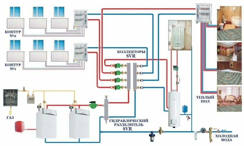 Если типовой настенный газовый или электрический котел работает на большую систему отопления, то встроенного циркуляционного насоса может быть недостаточно. Идеальным вариантом является применение гидравлического разделителя и небольших циркуляционных насосов на каждую зону.