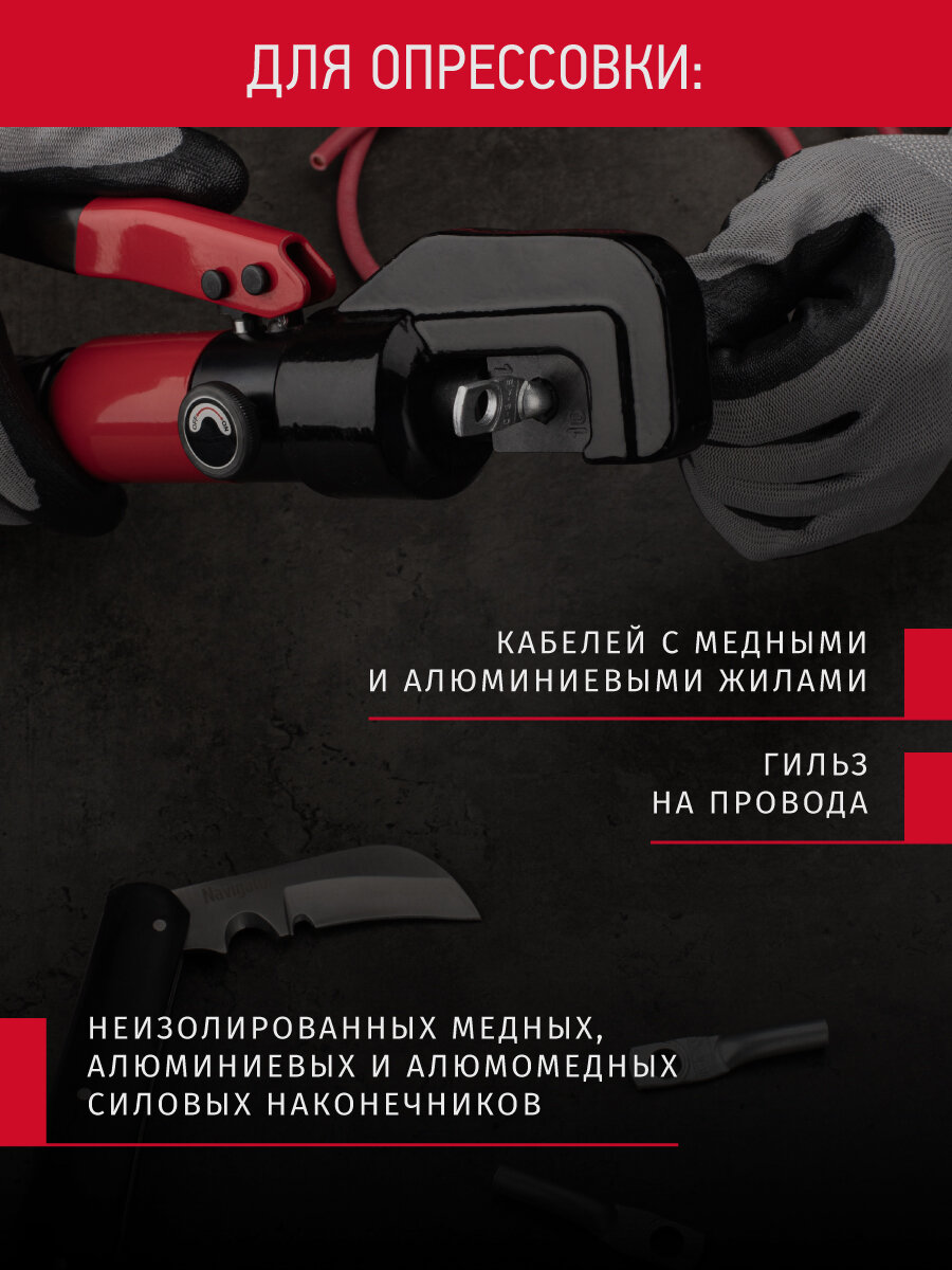 Пресс гидравлический ручной ПГР 70 от Онлайт — это профессиональный монтажный ручной инструмент, который предназначен для обжима гильз и наконечников проводов и кабелей, и создает усилие до 8 тонн. Пресс клещи позволяют создавать механические соединения типа кабельная жила-гильза или кабельная жила-наконечник с помощью механической опрессовки. Это может быть витая пара, телефонный, коаксиальный, медный, силовой или сетевой кабель Обжимные клещи снабжены комплектом сменных матриц, предназначенными для различных сечений жил от 4 кв.мм. до 70 кв.мм. Форма опрессовки - шестигранник.