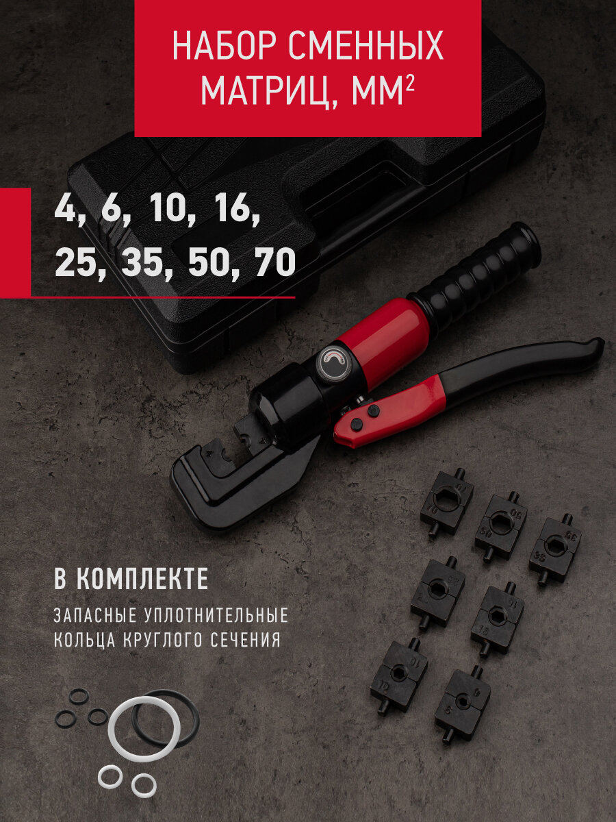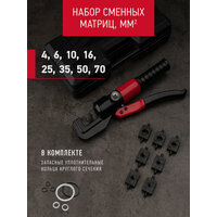 - Комплект сменных матриц для работы с кабелями различного сечения (4, 6, 10, 16, 25, 35, 50, 70 мм2).