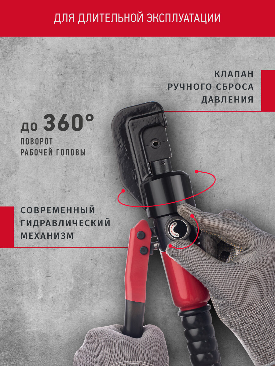 Современный гидравлический механизм пресса предназначен для длительной эксплуатации. Прочные и надежные матрицы гарантируют высокое качество опрессовки. Гексагональный профиль опрессовки обеспечивает равномерное обжатие хвостовика наконечника или кабельной жилы по всему периметру. Конструкция включает клапан ручного сброса давления, что значительно облегчает работу. Гидропресс оснащен уникальной системой защиты от протечек и произвольного падения внутреннего давления за счет прочного прижатия запорных элементов клапана к седлу. Обжимник кабеля поставляется в прочном пластиковом кейсе с эргономичной рукояткой для удобного хранения и транспортировки, в наличии также ремкомплект с запасными уплотнительными кольцами круглого сечения (требуется для обжимки интернет проводки).