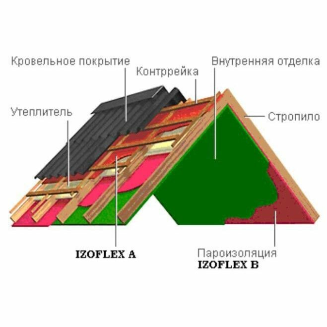 Изовекс A применяется как подкровельная гидро-, паро-, ветрозащитная мембрана в утеплённых кровлях с углом наклона свыше 35 градусов с различными покрытиями: натуральная черепица, мягкие битумные плитки, профилированные листы, металлочерепица и другие. Мембрана гидро ветрозащитная устанавливается над утеплителем поверх стропил под обрешеткой. Подкровельная ветро-пароизоляция необходима для защиты утеплителя и несущих элементов от ветра и конденсата. В качестве временной кровли ветрозащитные мембраны IZOVEX A не применяются.