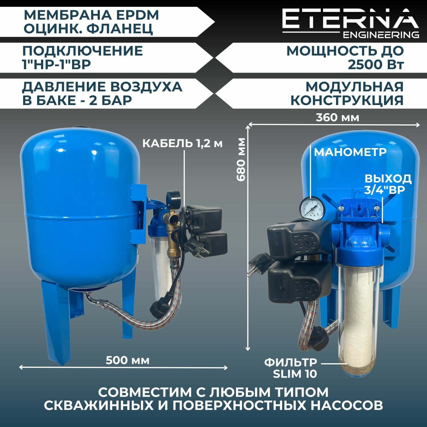 Представляем вашему вниманию гидроаккумулятор в сборе ETERNA АвтоБак АВ6С-50 с объемом 50 литров, представляющий собой идеальное решение для систем отопления и водоснабжения. Этот вертикальный гидроаккумулятор отличает высокое качество сборки и надежность, обеспечивая стабильное давление воды в трубопроводах. Специальная встроенная автоматика упрощает эксплуатацию и гарантирует долговечность устройства. Подключение диаметром 1 дюйм делает установку удобной и быстрой, а также предоставляет гибкость в выборе дополнительных аксессуаров. В комплекте идет фильтр, который защищает систему от попадания загрязнений и продлевает срок службы всех подключенных приборов. Данный гидроаккумулятор можно рассматривать как альтернативу таким популярным брендам, как Джилекс, Беламоc и другим продуктам, известных своим качеством и функциональностью. Если вам нужен бак для воды, который эффективно справится с задачами по поддержанию давления в системе водоснабжения и облегчению работы насосного оборудования, ETERNA АвтоБак АВ6С-50 станет отличным выбором. В отличие от моделей на 24 литра (24л), данный 50-литровый агрегат обеспечит более длительное время работы без необходимости частого включения насоса, что дополнительно экономит электроэнергию и увеличивает срок службы оборудования. Гидроаккумулятор в сборе от ETERNA поддерживает надежную работу системы и удобен в эксплуатации, что позволяет использовать его как в частных домах, так и в промышленных объектах. Имея аналогичные функции с моделями гидроаккумуляторов на 24 литра (24л), ETERNA АвтоБак АВ6С-50 предлагает больший объем для более масштабных задач. Независимо от того, нужен ли вам гидроаккумулятор для скважины или для системы отопления, ETERNA АвтоБак АВ6С-50 удовлетворит все ваши потребности.