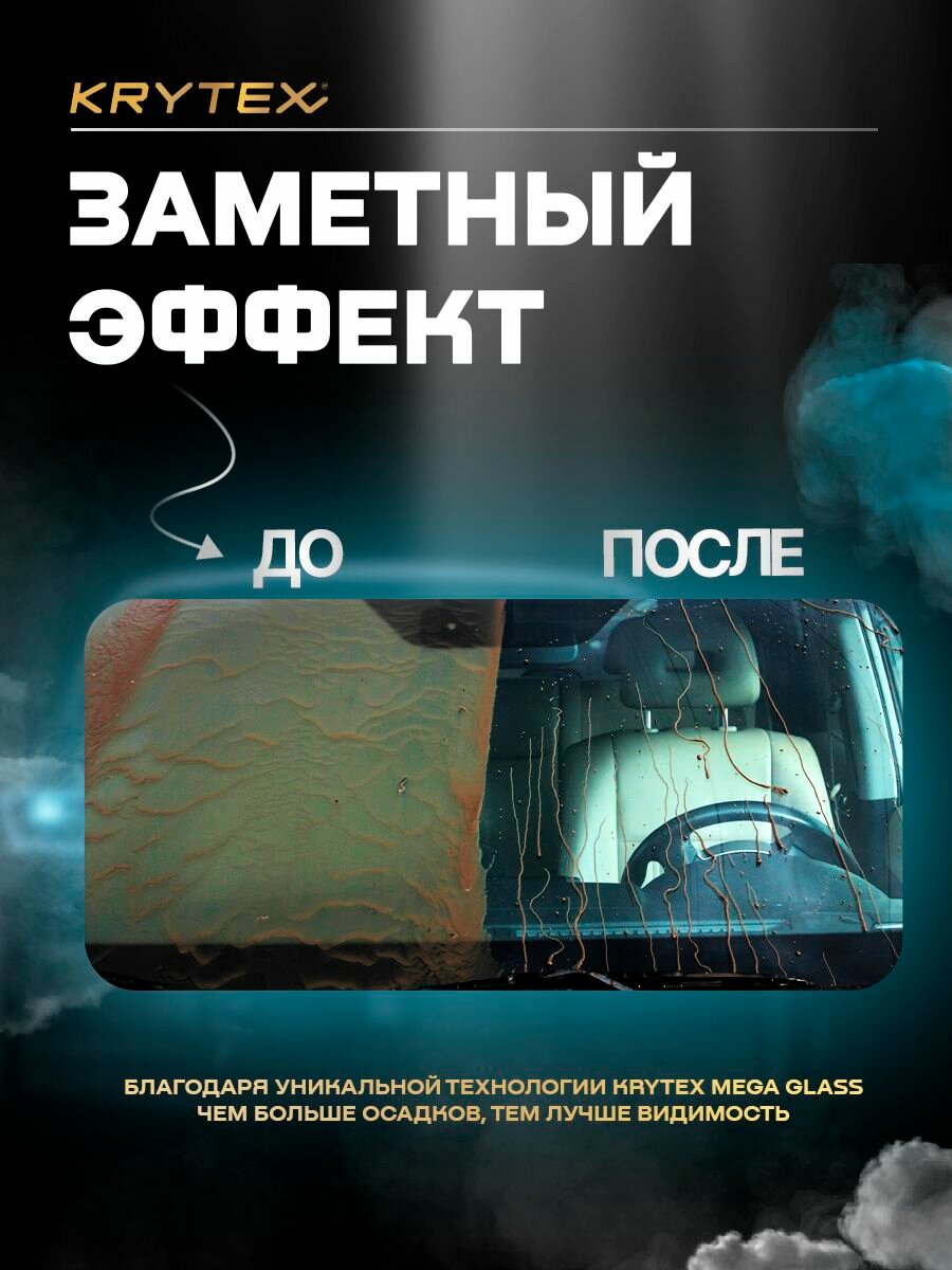 Отличительные особенности KRYTEX Mega Glass 2.0: Обновленная и улучшенная формула состава Высокая интенсивность работы Мощный водо- и грязеотталкивающий эффект Срыв капель начинается от 40 км/ч Свойства: антидождь, антигрязь, антилед Сильнейшая адгезия к поверхности Уменьшает запотевание до 65% Уменьшает загрязнение стекла и существенно упрощает очистку Уменьшает использование стеклоомывающей жидкости до 10 раз Увеличивает срок службы дворников в 5 раз Улучшает видимость во время движения в непогоду Отличный барьер от образования наледи Способствует безопасности движения Повышает комфорт управления Блокировка ультрафиолета повышает сопротивление теплу, защищает внутренние поверхности от нагревания и выгорания Высокая стойкость к щелочам и кислотам Возможность использовать в быту: стеклопакеты, душевые кабины, зеркала и тд. Проверен временем во всех регионах РФ и СНГ