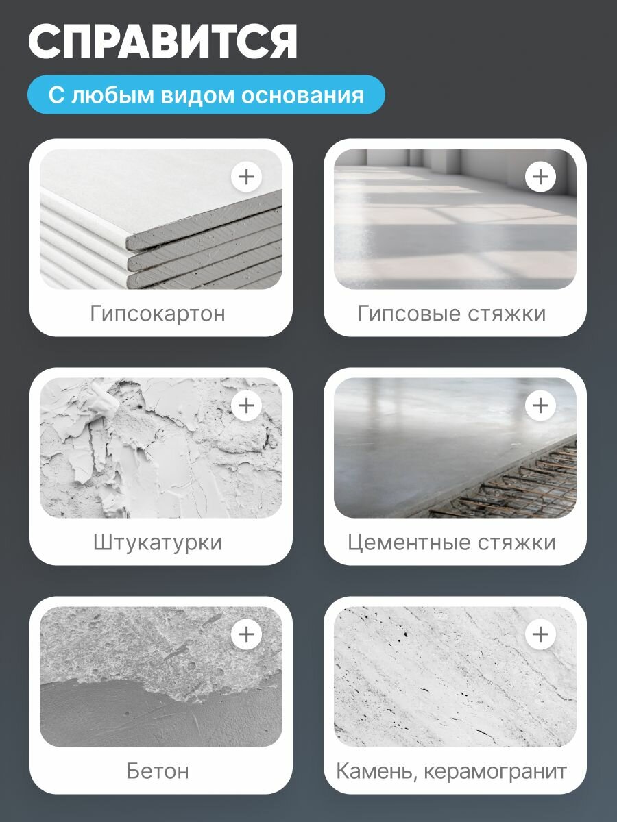 Защита бетонных, цементных и гипсовых поверхностей от влаги перед укладкой плитки. Обеспечивает долговечность отделки и предотвращает появление плесени и грибка.