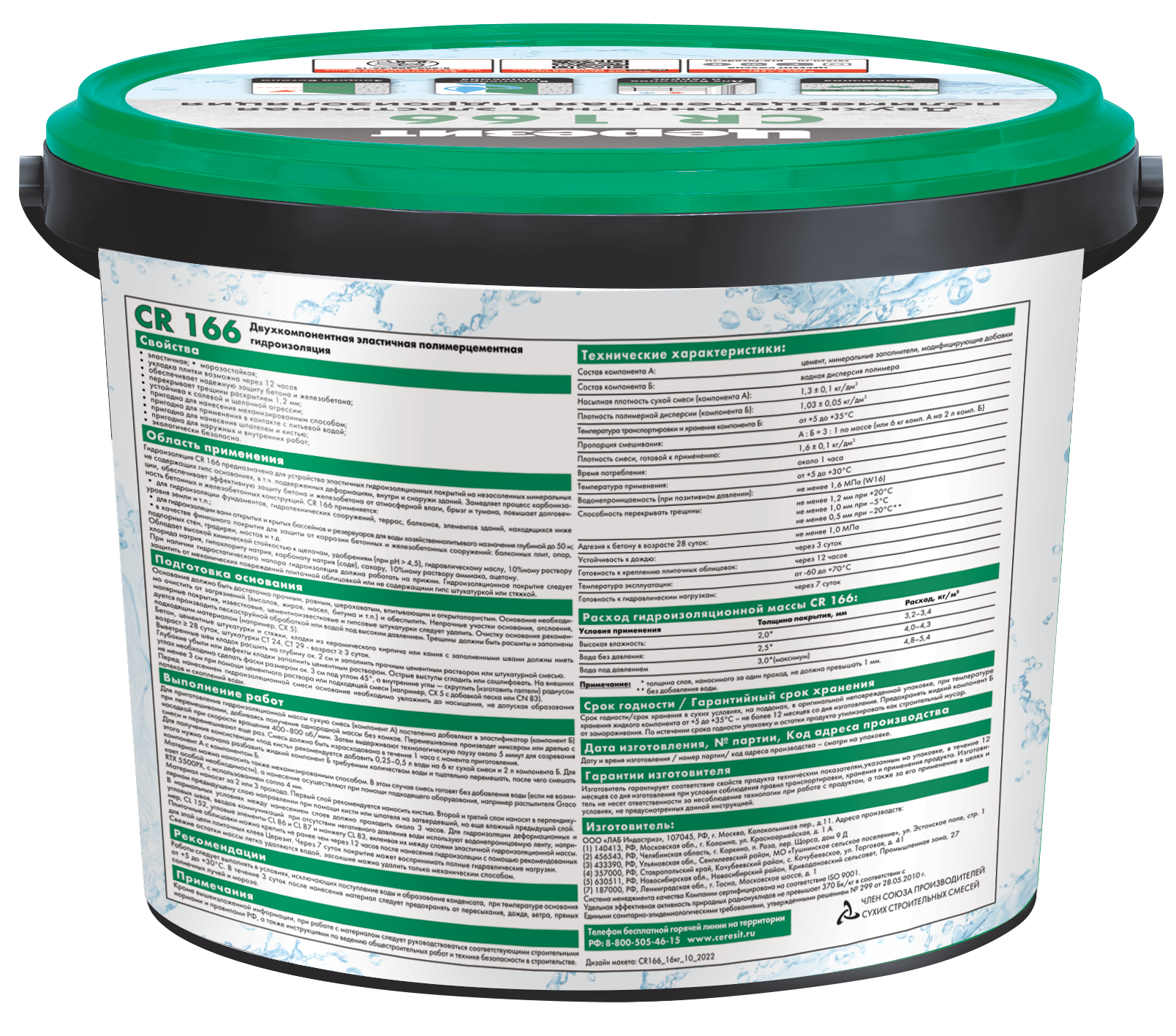 Гидроизоляционная масса Ceresit CR 166 - это двухкомпонентное средство, которое обеспечивает надежную гидроизоляцию различных поверхностей. Продукт состоит из двух компонентов: компонента А и компонента Б, каждый из которых весит 8 кг.