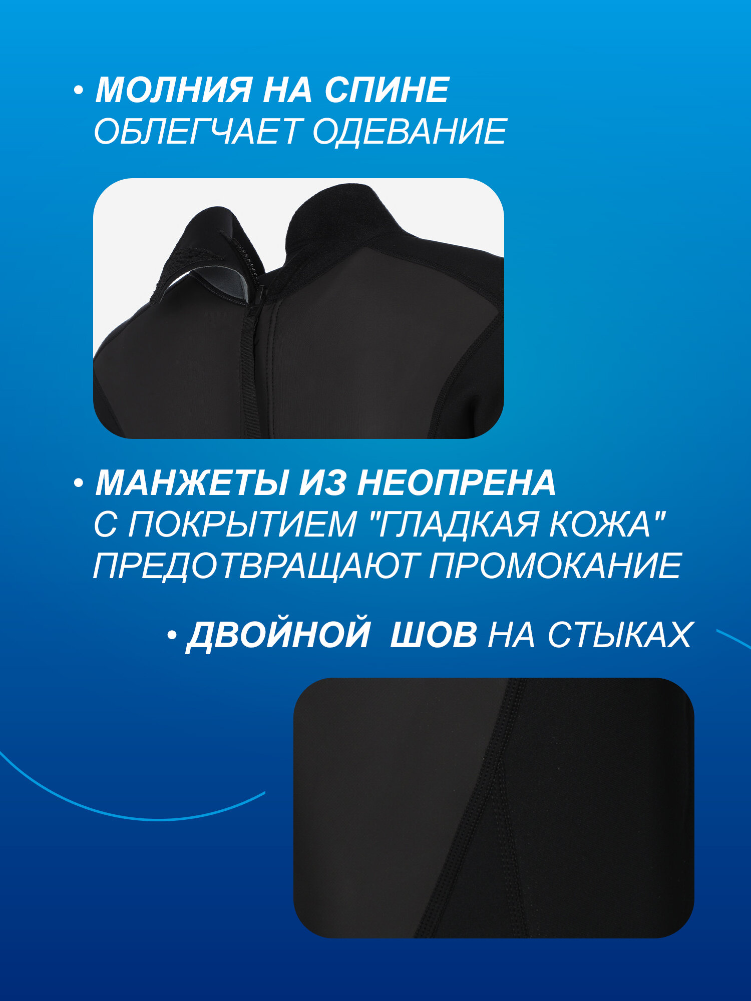 Прочность гидрокостюма обеспечивается двойными швами на всех стыках, что делает его долговечным и надежным в использовании. Защита от влаги обеспечивается манжетами из неопрена с покрытием "гладкая кожа", которые не только предотвращают промокание, но и усиливают обтюрацию, обеспечивая максимальную герметичность и защиту от влаги.