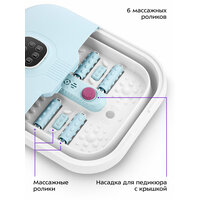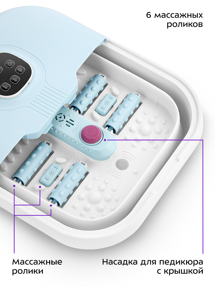 Усталость – прочь! Гидромассажная ванна КТ-5904 поможет снять усталость, уменьшить отёки, улучшить циркуляцию крови и расслабить мышцы стоп с помощью гидро-массажа и пузырькового массажа. Температура воды настраивается: вы можете установить нагрев воды до 42,44 или 46 °C. Съёмные массажные ролики Массажные ролики устанавливаются в пазы на корпусе устройства и помогают снять усталость и напряжение стоп, расслабить мышцы и улучшить кровоток. Также, массажные ролики позволяют принять стопе удобное положение. Ролики не вращаются автоматически. Встроенный таймер Гидромассажная ванна для ног оснащена таймером на 20 и 30 минут. По прошествии этого времени устройство автоматически выключится. Если таймер не будет включён, и вы не выключите устройство вручную, автоотключение произойдёт через 60 минут. Простое управление В задней части ванны расположена кнопка включения. Так же в комплекте с прибором идёт пульт. После выбора температуры воды с помощью пульта ДУ - начнётся нагрев, индикатор температуры будет гореть в соответствии с температурой в реальном времени. Компактное хранение После использования ванну можно сложить до почти плоского состояния и убрать в любое удобное для вас место. Аппарат не займёт много пространства, что делает его хранение практичным. Удобное хранение пульта Сверху гидромассажной ванны есть магнитная зона для установки пульта дистанционного управления (ДУ), однако вы можете держать пульт ДУ в руках. Так же вместе с пультом в комплекте идёт батарейка.