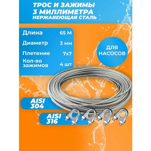 Трос из нержавеющей стали 7×7 AISI 304, 3мм бухта 65 метров + зажим 3-4 мм 4шт, трос нержавеющий для скважины: сравнение цен, характеристики, фото, актуальное наличие и цены.