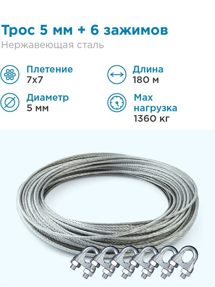 Купить Трос из нержавеющей стали 7×7 AISI 304, 5мм бухта 180 метров + зажим 5 мм 6 шт, трос нержавеющий для скважины с доставкой по всей России. Трос из нержавеющей стали 7×7 AISI 304, 5мм бухта 180 метров + зажим 5 мм 6 шт, трос нержавеющий для скважины: сравнение цен, характеристики, фото, актуальное наличие и цены.