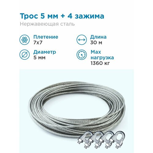 Трос из нержавеющей стали 7×7 AISI 304, 5мм бухта 30 метров + зажим 5 мм 4шт, трос нержавеющий для скважины: сравнение цен, характеристики, фото, актуальное наличие и цены.