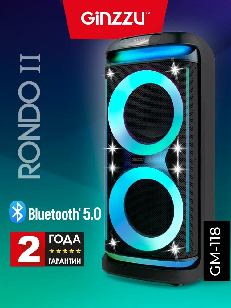 Ginzzu GM-118 RONDO II Портативная беспроводная блютуз колонка / Акустическая система MIDI с Bluetooth 5.0 230Вт вход 2 микрофона и 1 гитара USB/microSD FM, пульт ДУ, эквалайзер, стробоскоп: сравнение цен, характеристики, фото, актуальное наличие и цены.