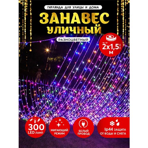 Гирлянда уличная на дом имеет практичный размер 2x1,5 метров, что позволяет легко украсить даже большие окна или стены. При выборе, стоит обратить внимание на количество светодиодов на метр: чем их больше, тем ярче будет светить гирлянда. Отличный выбор для создания праздничного настроения и украшения территории в темное время суток. Правильно подобранная гирлянда обеспечит яркий и красочный декор, который будет радовать глаз и создавать уют на вашем участке. Ширина занавеса 2 м, 12 вертикальных нитей длиной 1,5 м. Общее количество LED ламп 300 шт. Цвет LED ламп - RGB цветной. Цвет провода - белый. Имеет статичное свечение с флэш эффектом, каждый 8-ой диод. Напряжение - 220 V. Мощность - 13,8 W.