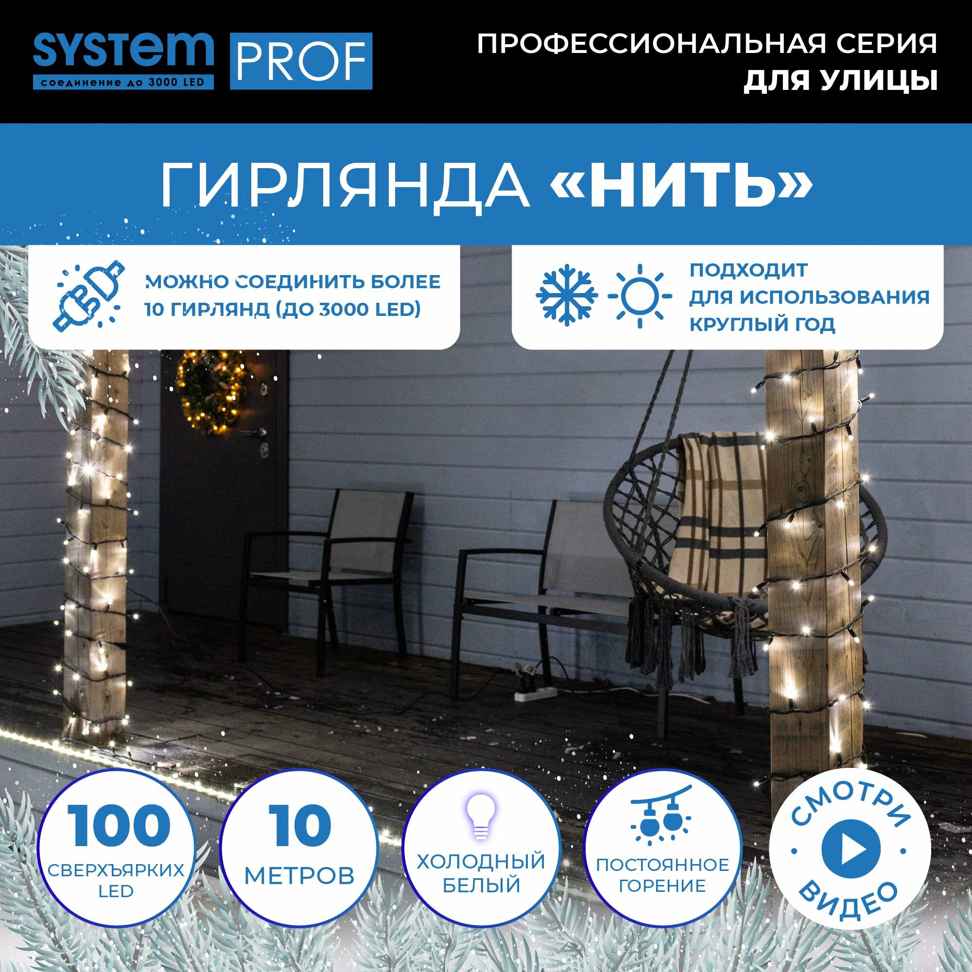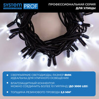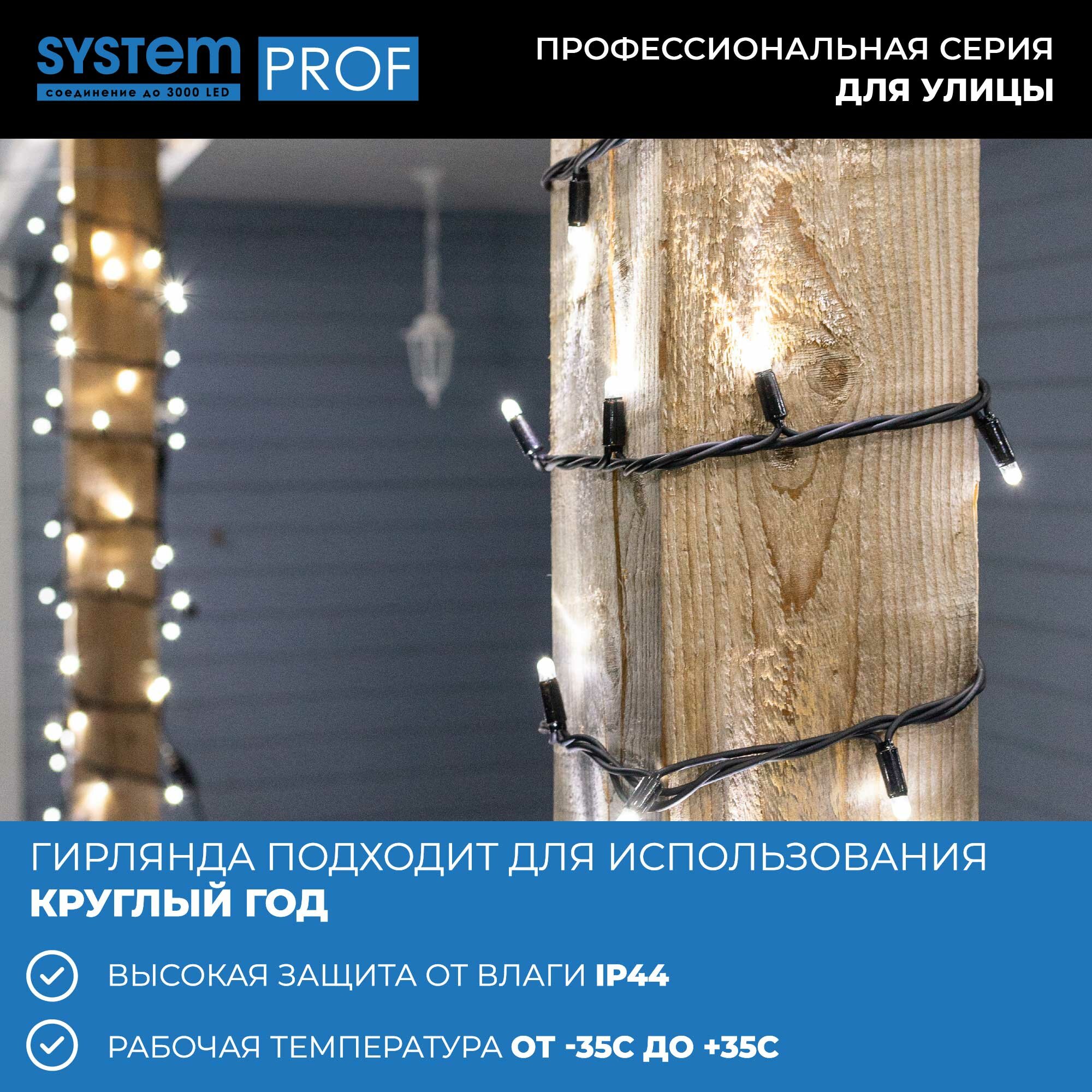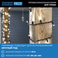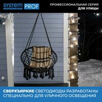Профессиональная серия гирлянд System Prof для улицы. Все гирлянды серии можно соединить между собой в одну цепочку с работой от одного блока питания без потери яркости. Работает от сети.